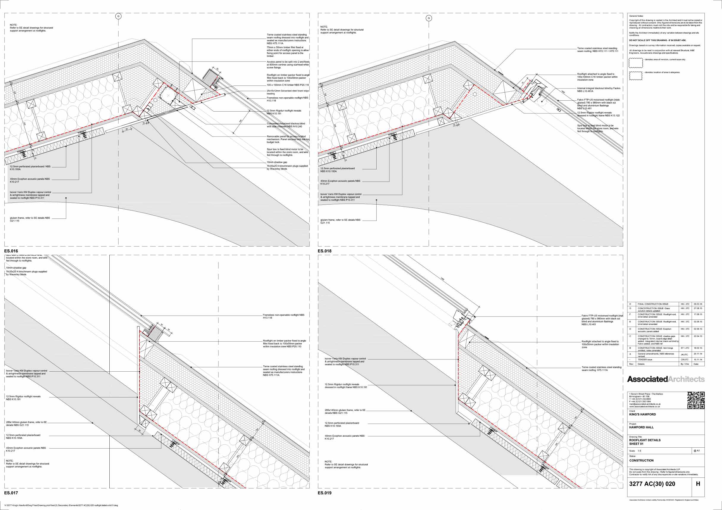 Glassolutions fixed rooflights structurally glazed with galvanized steel profiles, aluminium cover flashings, 50.8mm triple glazed units SGG Coolite SKN154, 8.8mm SGG STADIP clear laminated glass externally, followed inside by 16mm argon cavity, 4mm SGG SECURIT clear toughened glass, 16mm argon cavity, 6mm SGG SECURIT toughened glass outer. Glazing U-value (centre pane): 0.53 W/m2K