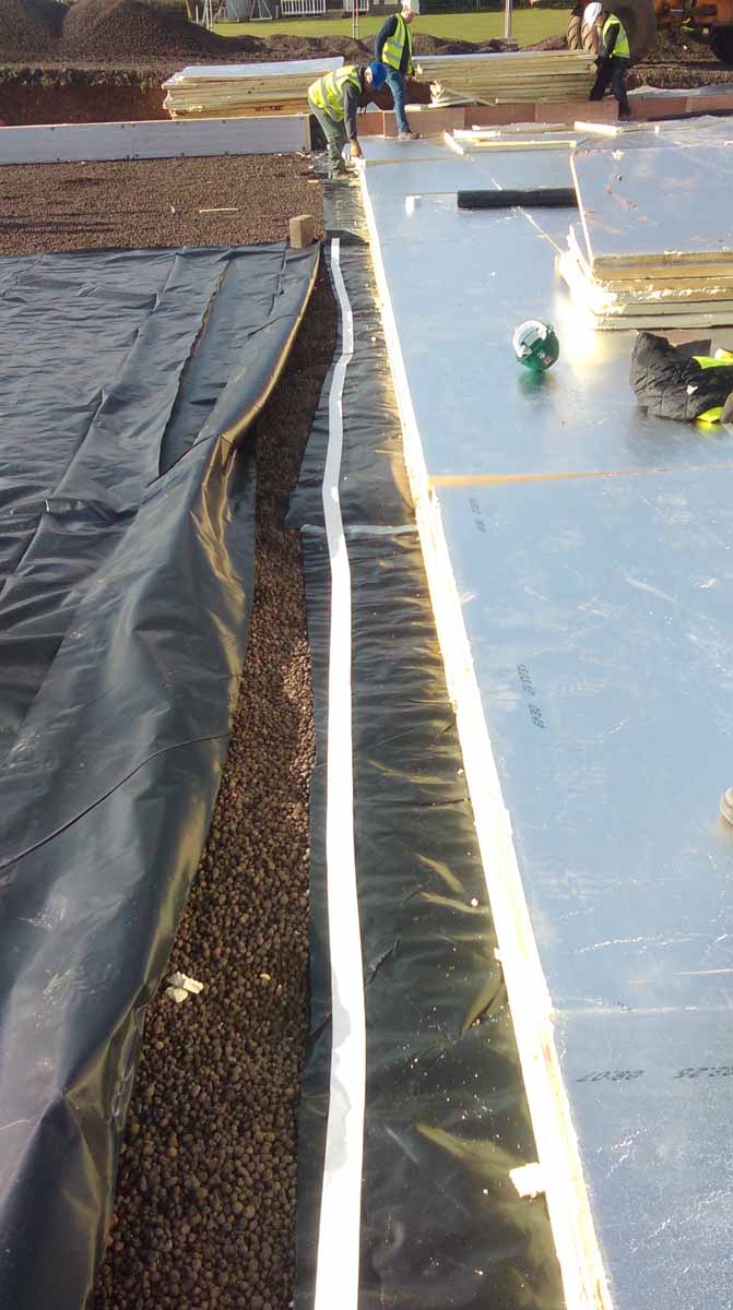 Celotex FR5000 insulation boards being fitted over the polyethylene DPM and 175mm Leca Insufil expanded clay insulation