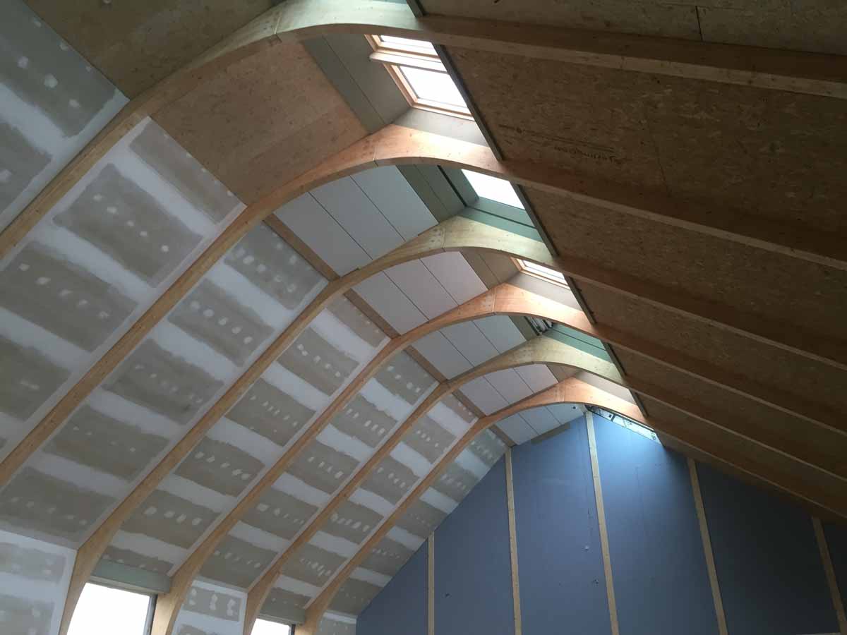 The roof and wall build-up features Isover Timber Frame Batt 32 insulation with Isover Vario KM Duplex vapour control and airtightness membrane to the inside of this