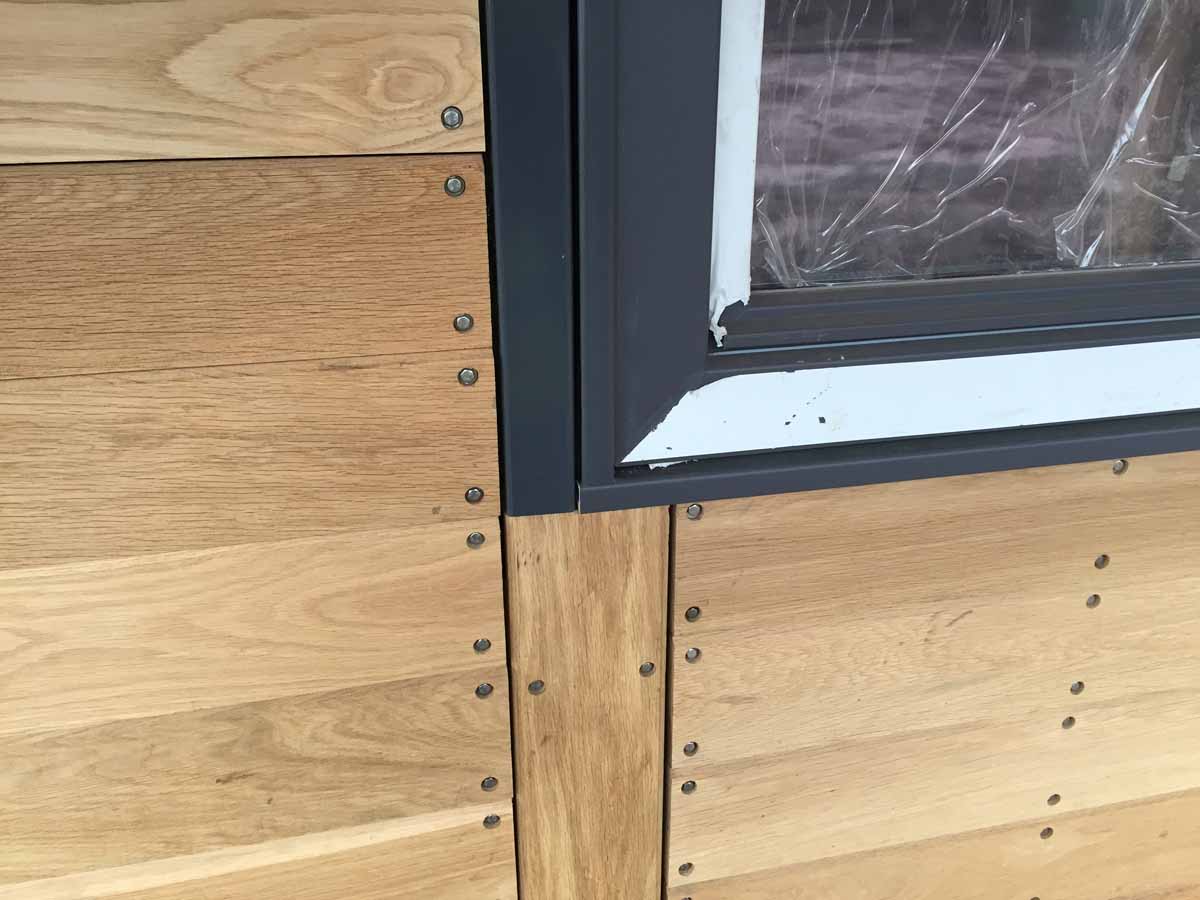 Rehau triple-glazed windows installed flush with the external oak cladding, with the insulation layer sitting behind this