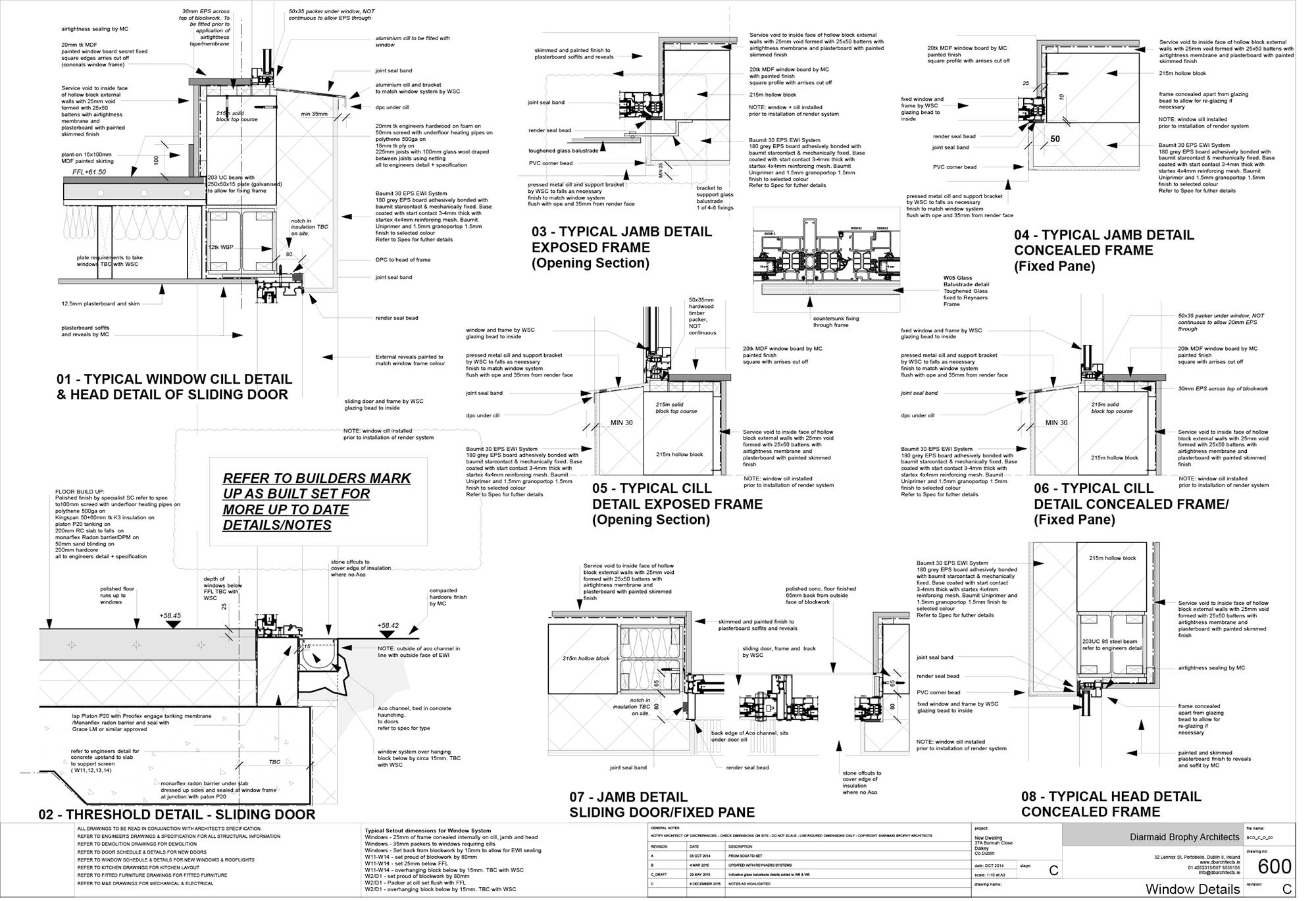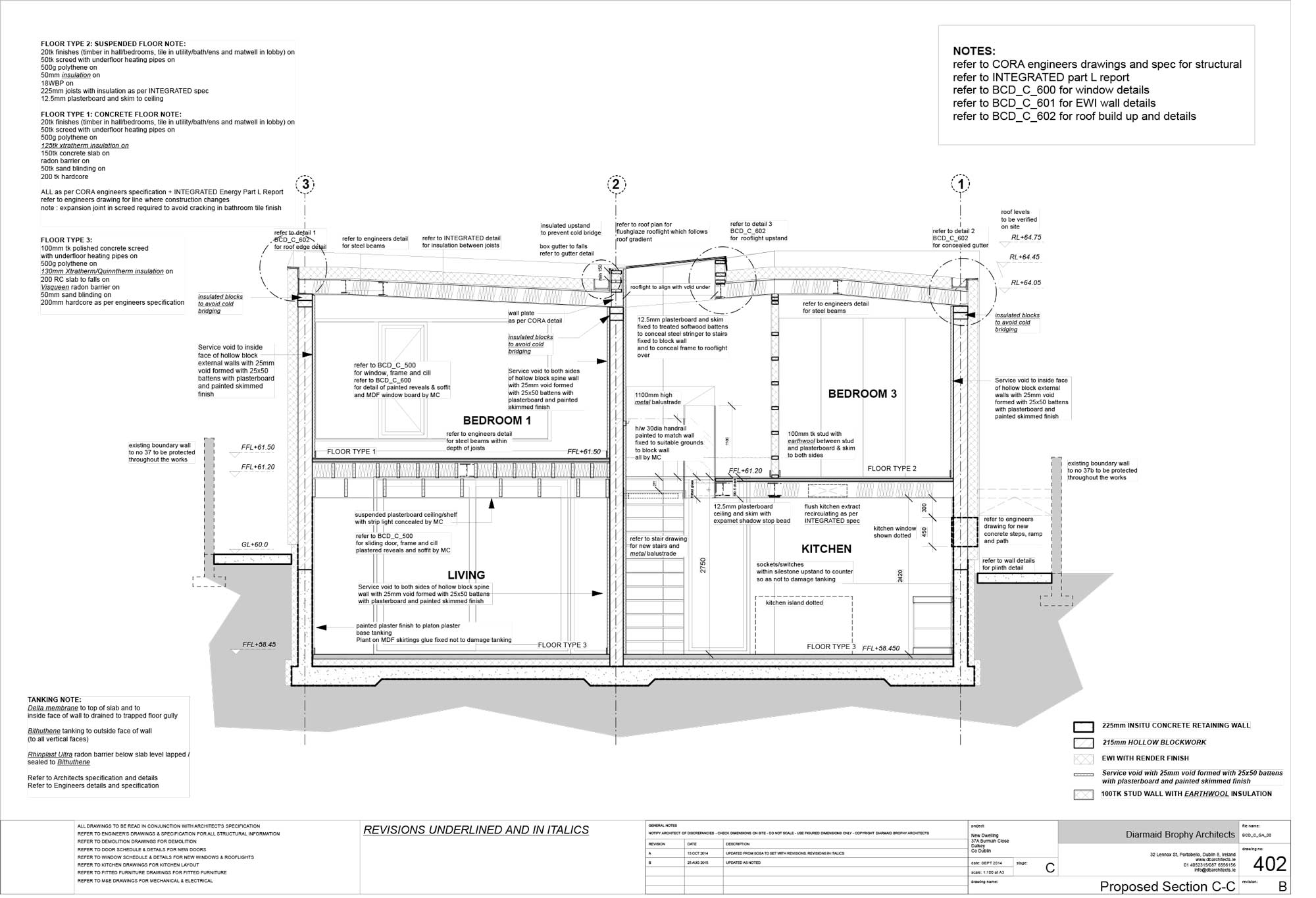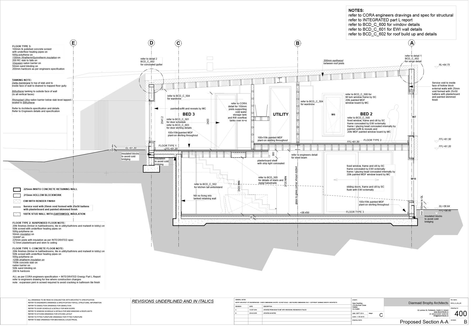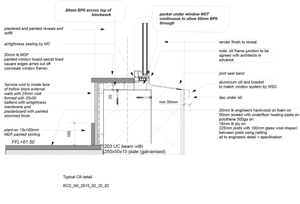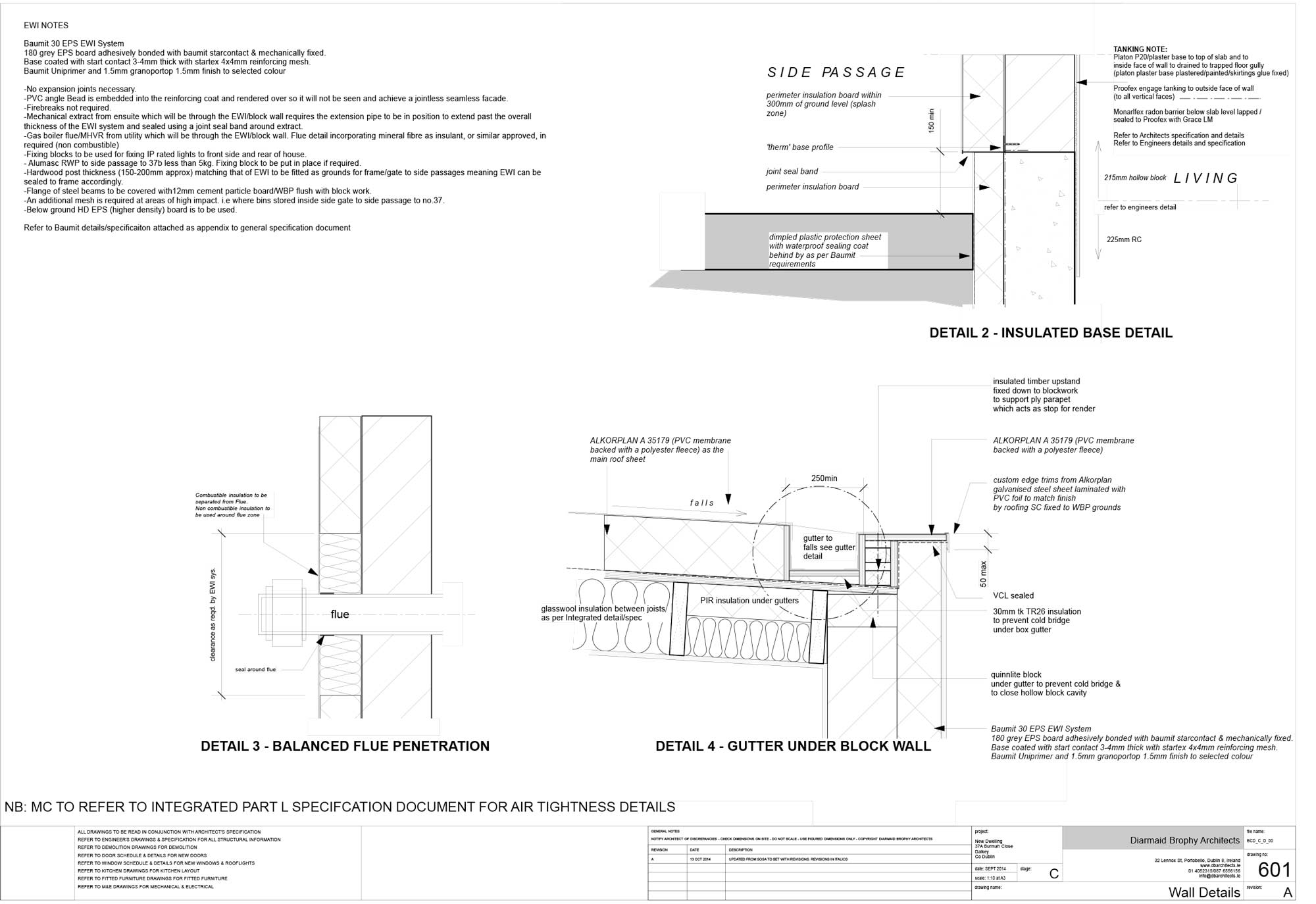 Walls: Baumit 30 EPS EWI System with 180mm graphite EPS board, followed inside by 215mm hollow block, 25mm service void formed with 25x50 battens, Intello airtightness membrane, plasterboard, skim finish internally. U-value: 0.17 W/m2K