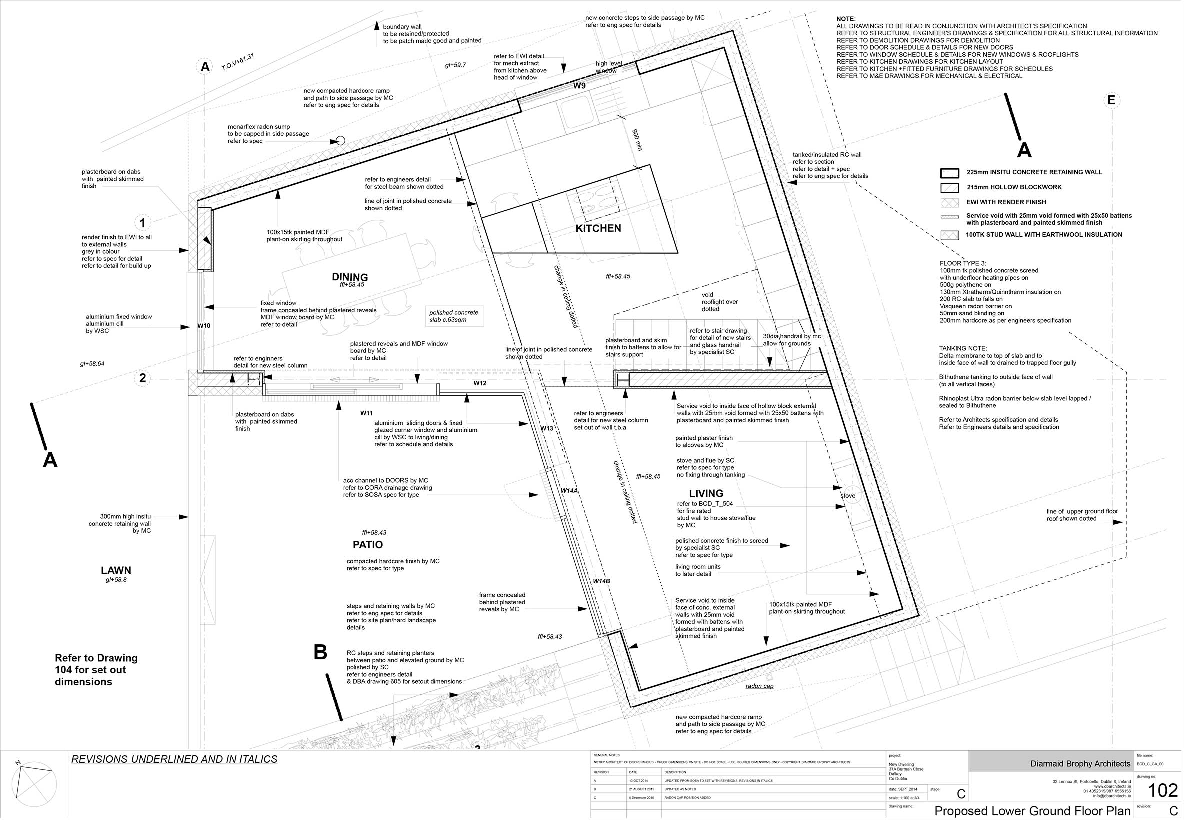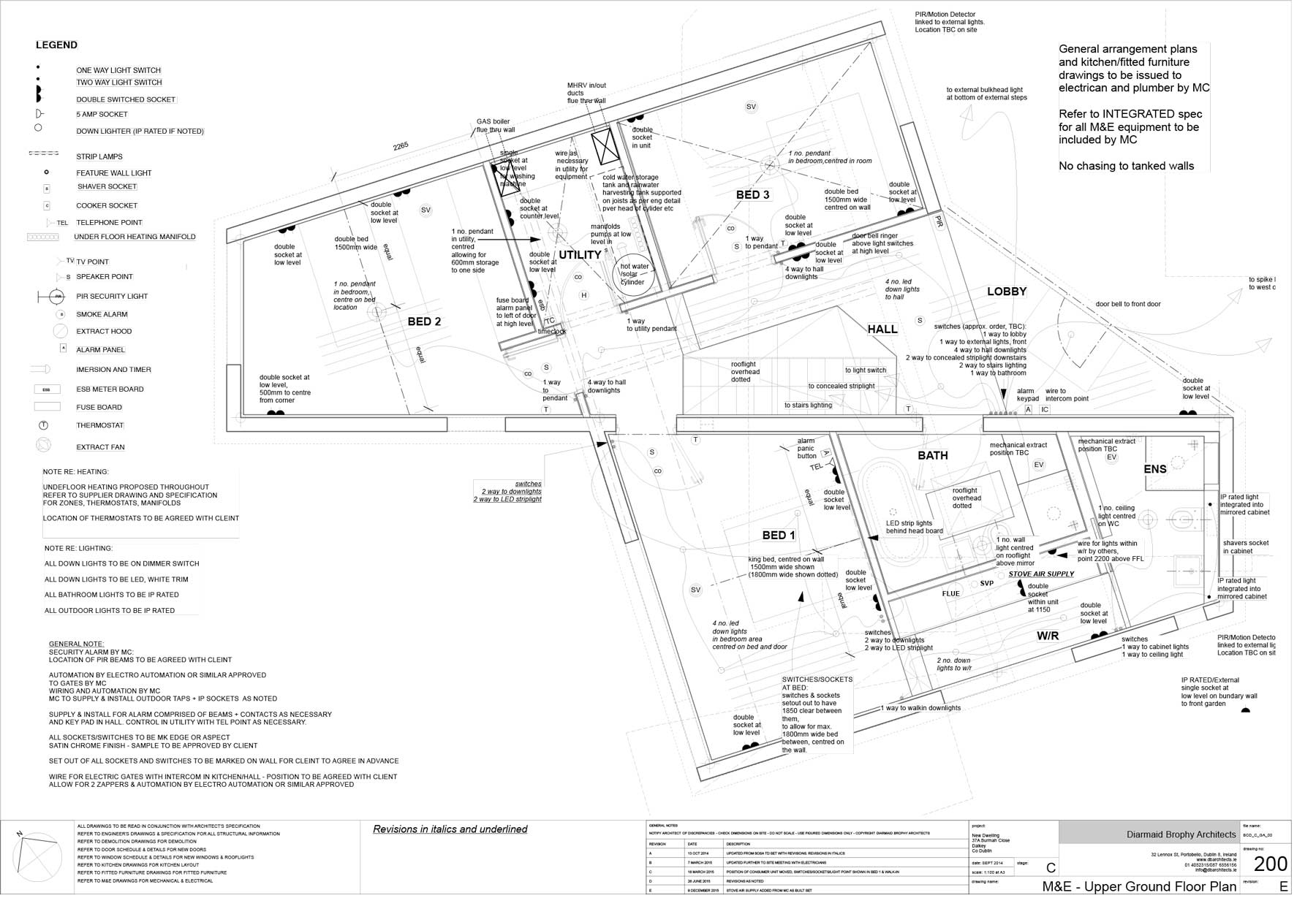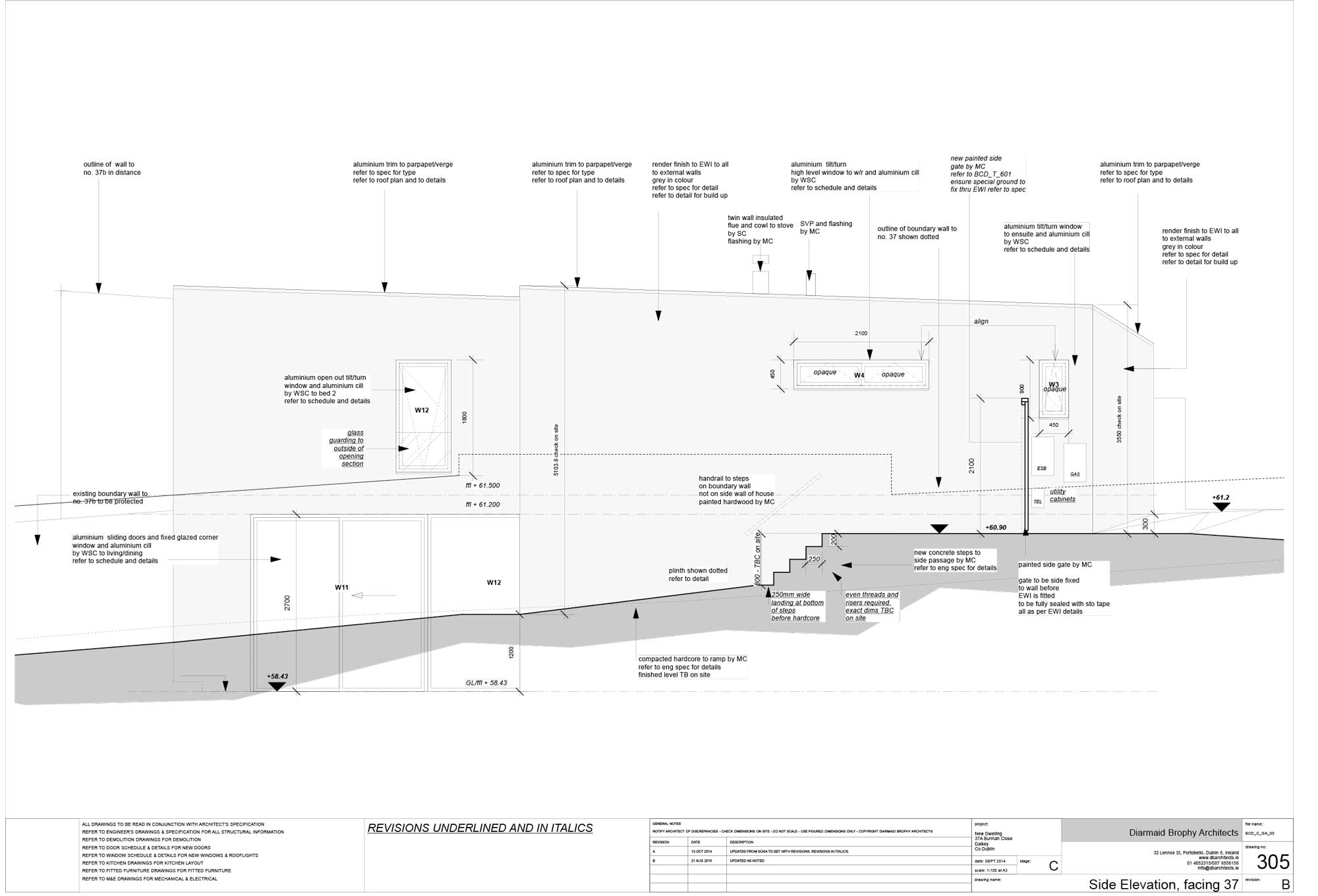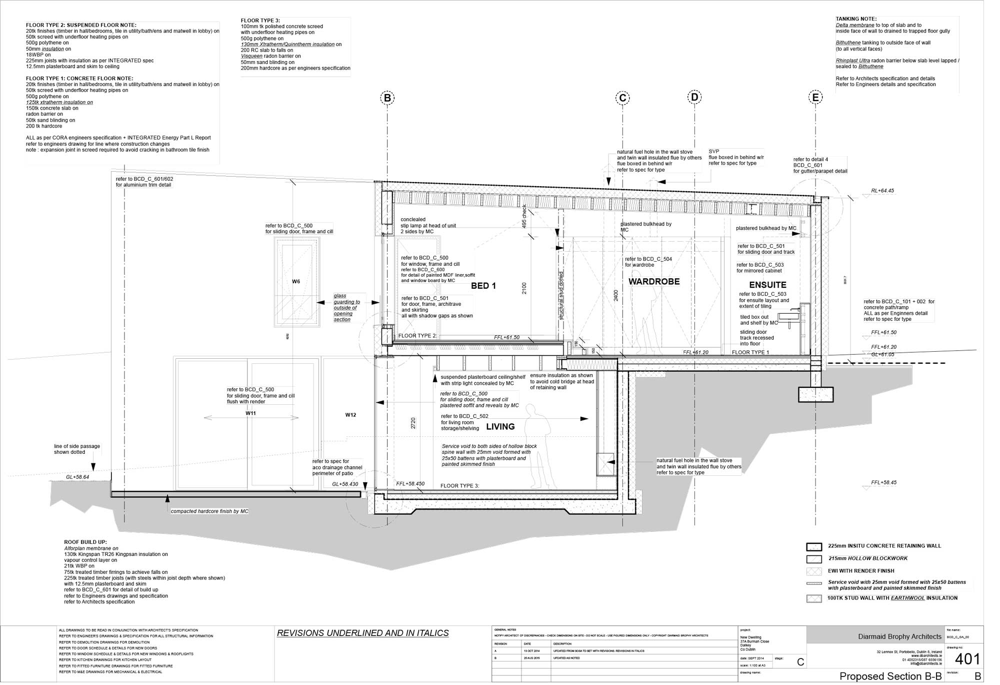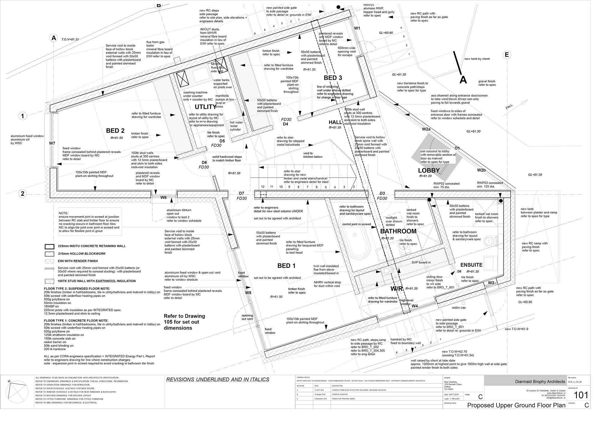 Walls: Baumit 30 EPS EWI System with 180mm graphite EPS board, followed inside by 215mm hollow block, 25mm service void formed with 25x50 battens, Intello airtightness membrane, plasterboard, skim finish internally. U-value: 0.17 W/m2K