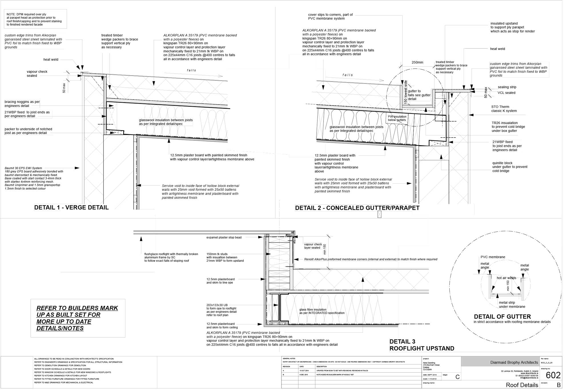Roof: Alkorplan (PVC membrane backed with a polyester fleece) externally followed underneath by 170mm Xtratherm FR-ALU, vapour control layer, 21mm WBP, 225x44mm joists with Knauf Earthwool loft roll, Intello airtightness membrane, plasterboard, skim finish. U-value: 0.10 W/m2K