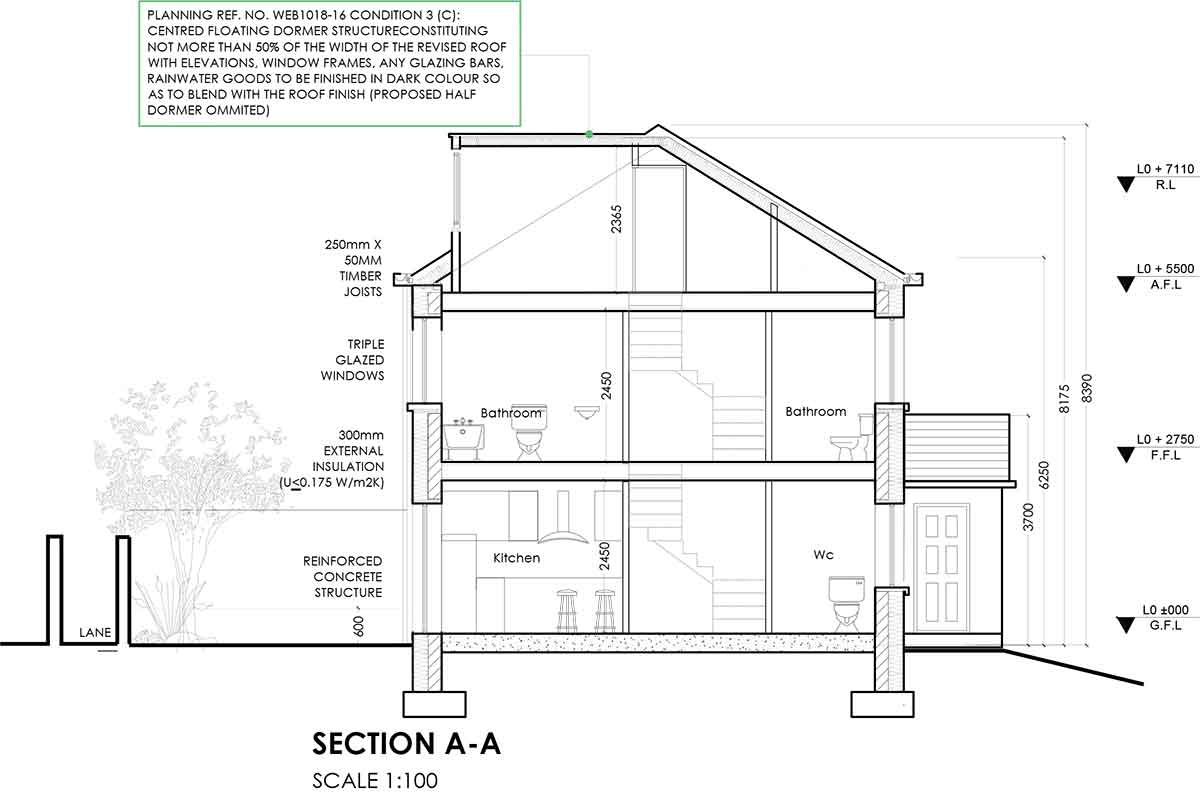 Insulation is provided by a KABE Therm external insulation system with 300mm expanded polystyrene, finished with a wet dash in order to mimic the other, older houses in the street. “It allowed us to ensure that there are no gaps and allows you to avoid cold bridging at the corners of the building. It’s taken right down to the foundations, as well.”