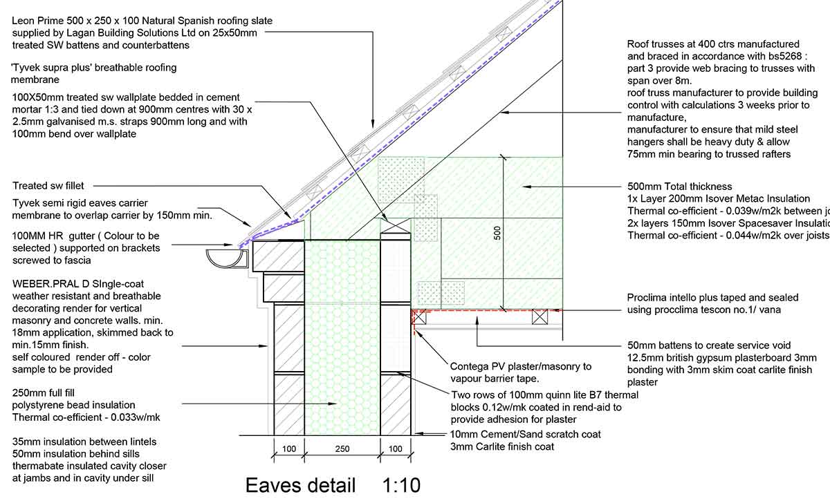 Roof: SSQ Spanish slates externally on 50 x 35mm battens/counter battens, followed underneath by Tyvek breathable roofing underlay, timber rafters fully filled with 150mm Kingspan Aerofit EPS insulation between rafters, Isover Vario vapour control and airtightness membrane, 100mm Kingspan TP10 PIR above rafters, 50mm uninsulated service cavity, 12.5mm plasterboard ceiling. U-value: 0.112 W/m2K. Plus 450mm Isover Metac insulation at ceiling level to bedroom section. U-value: 0.091 W/m2K
