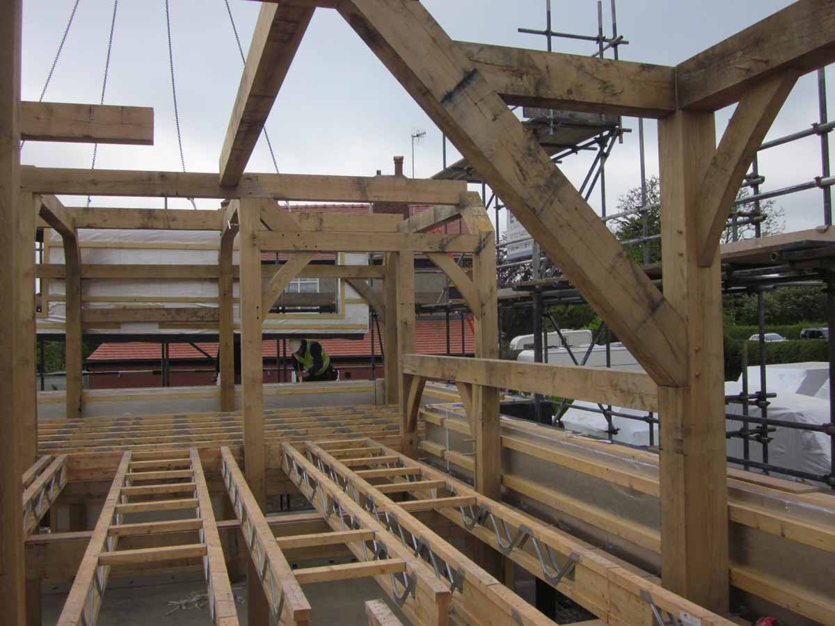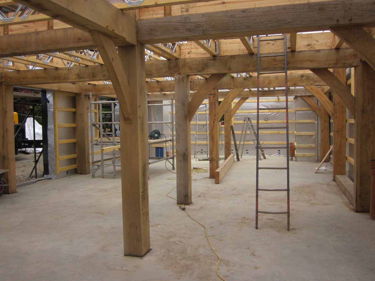 The internal frame of green oak which takes the main structural load of the roof and upper floor