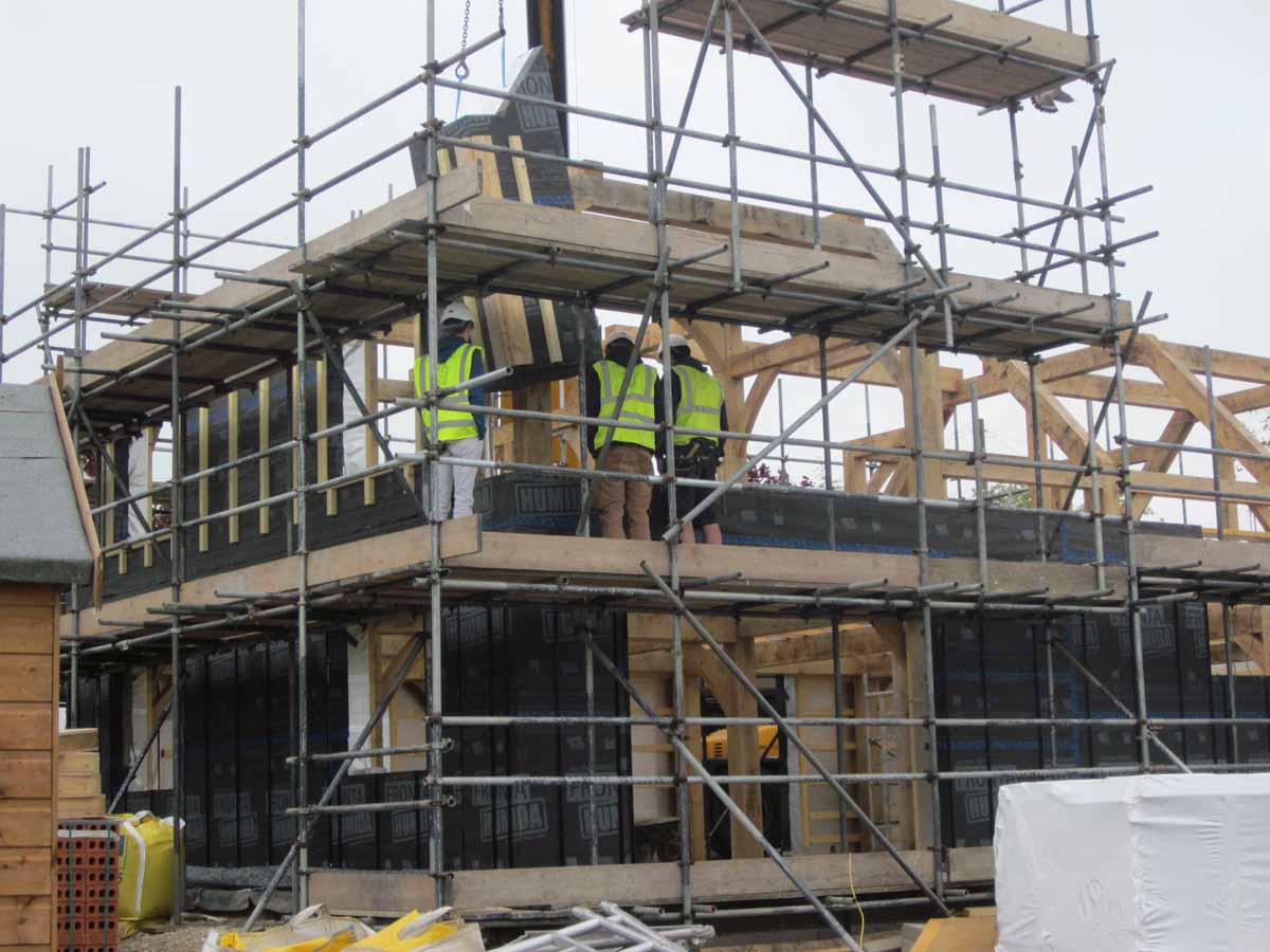 A crane lifting into place the cellulose-insulated timber wall panels, which wrap around the outside of the oak frame