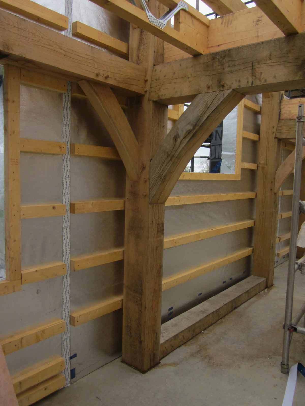 Most homes with green oak frames place the oak columns within the insulation layer. But that wouldn’t work for a passive house, because it would displace insulation and create a big thermal bridge.