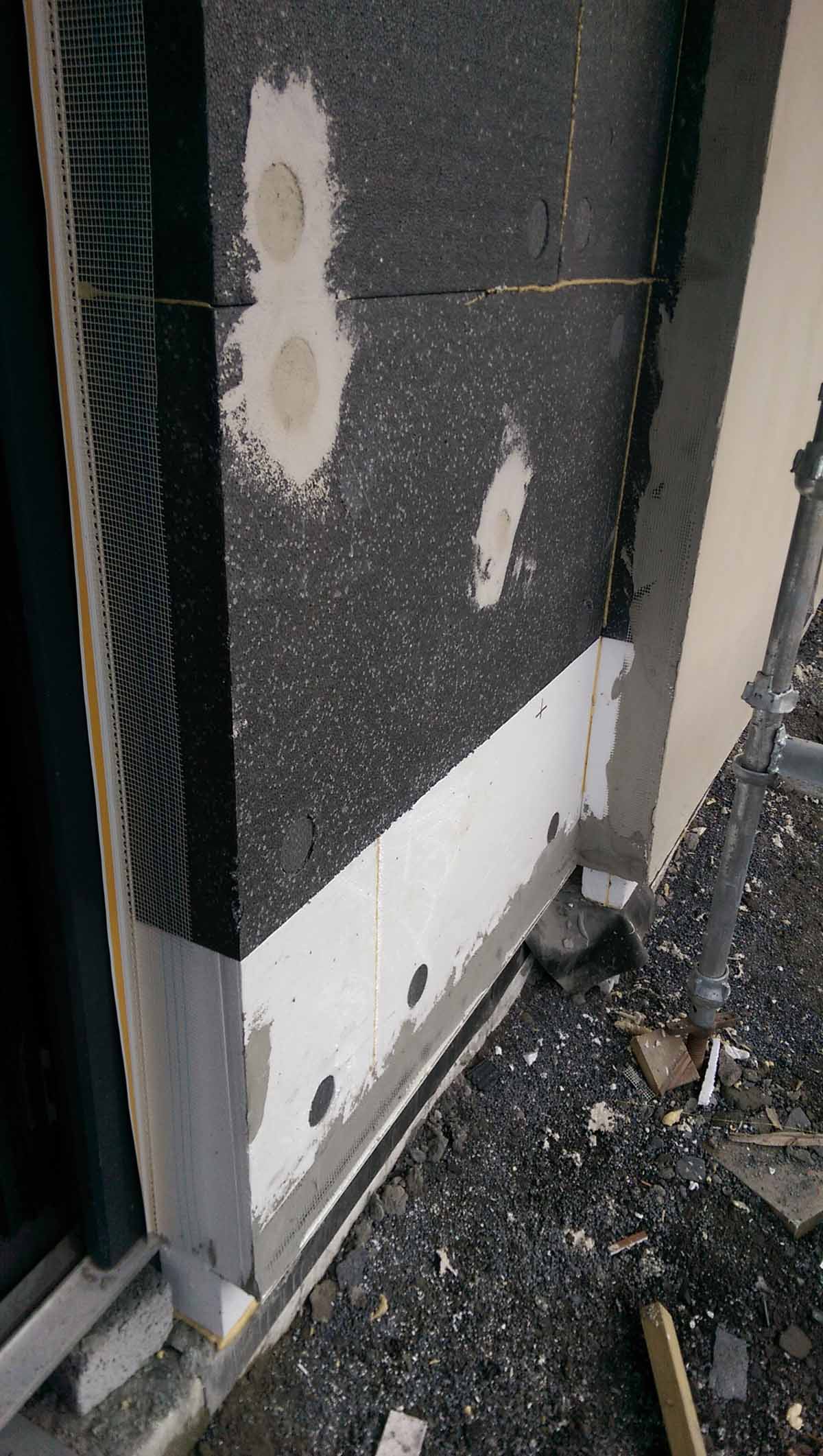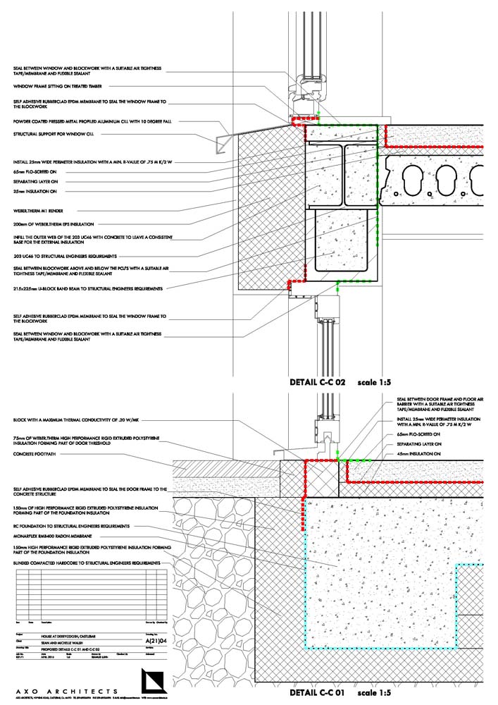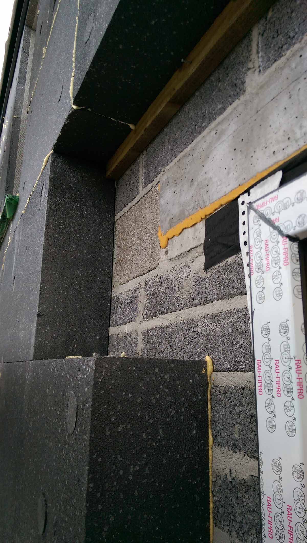 Walls: Atlas Aval external render on 200mm EPS insulation, on 215mm concrete block-on-flat single leaf construction with 15mm internal render. U-value: 0.13 W/m2K.