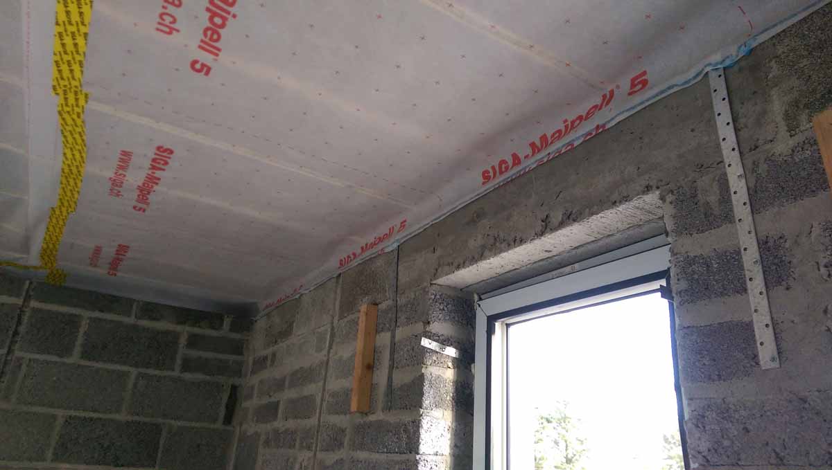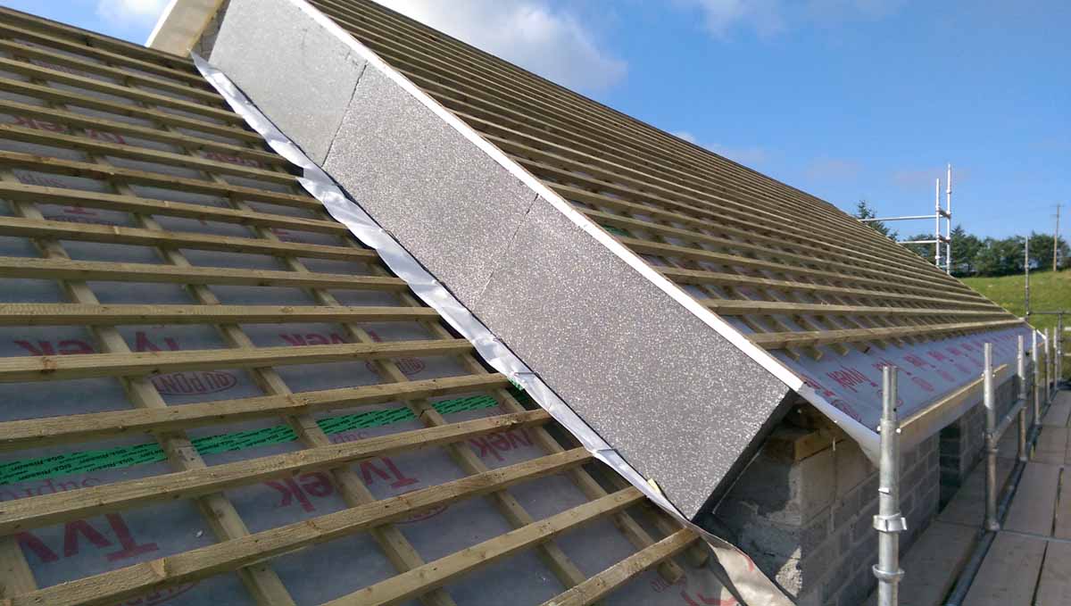 DuPont Tyvek Supro roofing underlay, plus external insulation strip between the low and high roofs