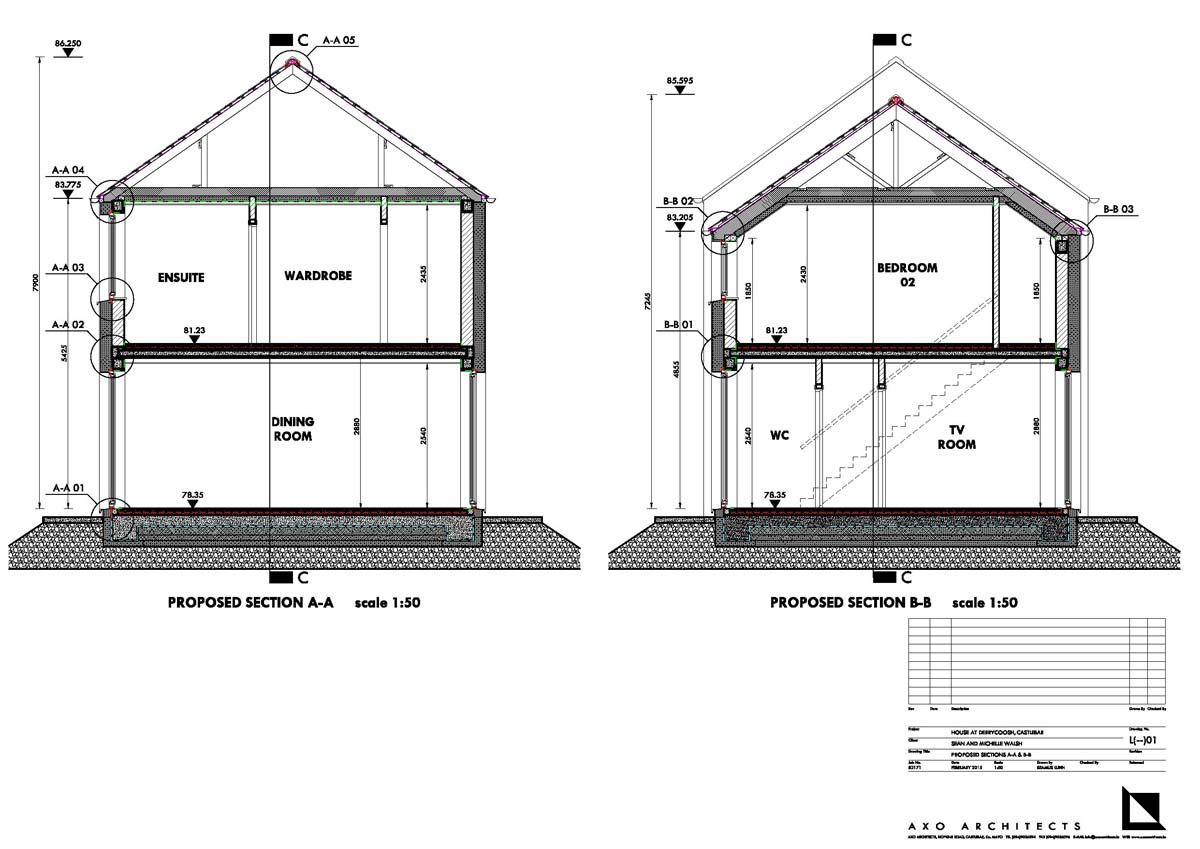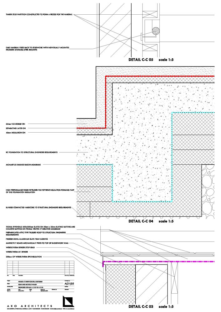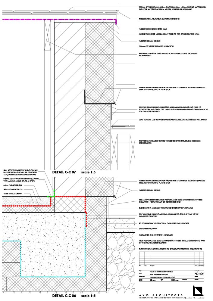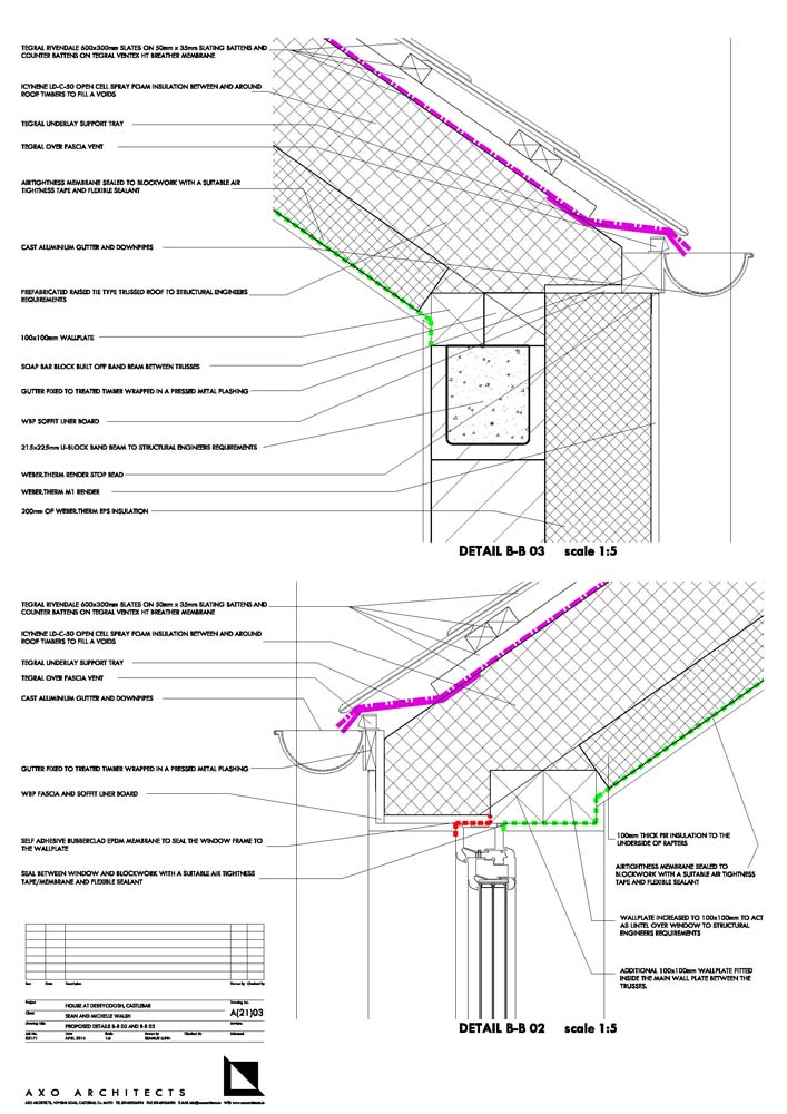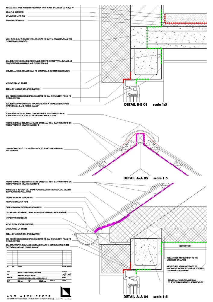 Roof: Natural slates externally, on 35x45mm slating battens and counter battens, on DuPont Tyvek Supro underlay, on timber rafters insulated with 300mm Isover Metac roll insulation, on Siga airtightness membrane and tapes, on 50mm uninsulated service cavity, QuinnTherm 50mm insulated plasterboard to underside. U-value: 0.11 W/m2K.