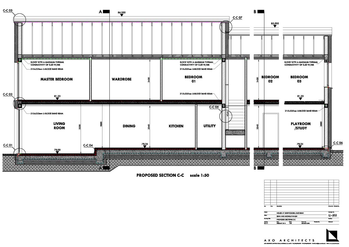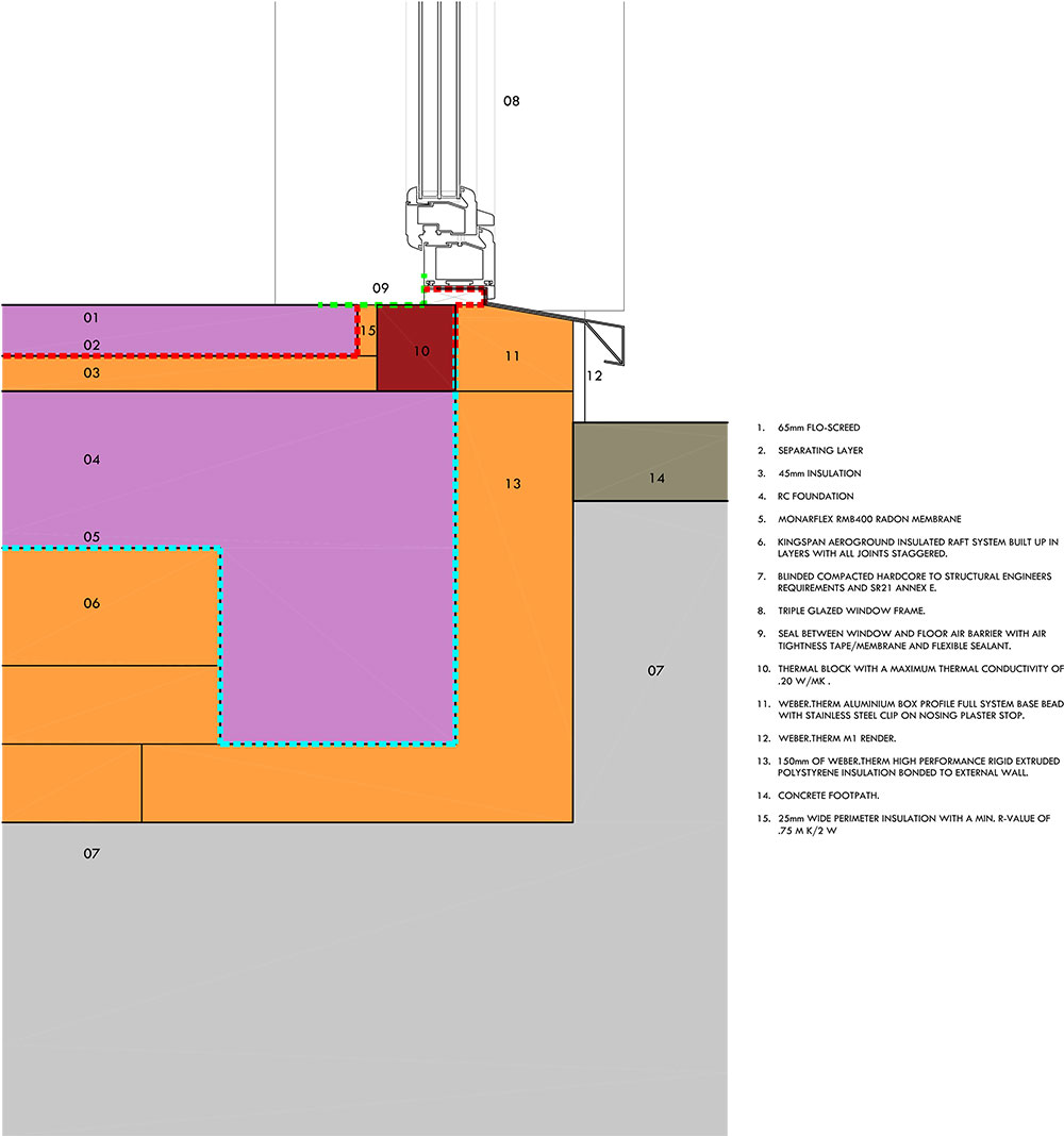 Ground floor: 350mm Kingspan Aeroground insulated foundation system, with concrete raft and insulated screed for underfloor heating. U-value: 0.090 W/m2K.