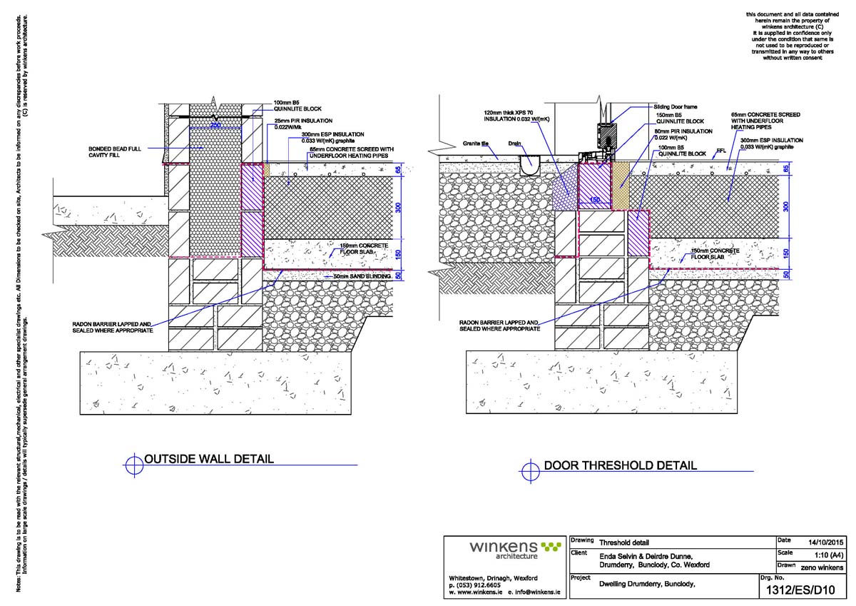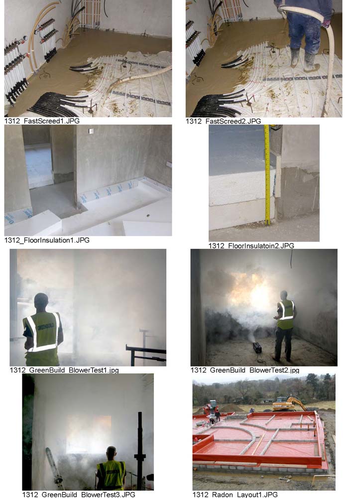 Ground floor: Strip foundation, concrete floor slab insulated above with 300 mm rigid insulation EPS100 and PIR strip around perimeter. 65mm Sudanit 280 fast screed above EPS with underfloor heating pipes embedded. Radon barrier under slab for airtightness taped to internal plaster layer on walls. U-value: 0.107 W/m2K