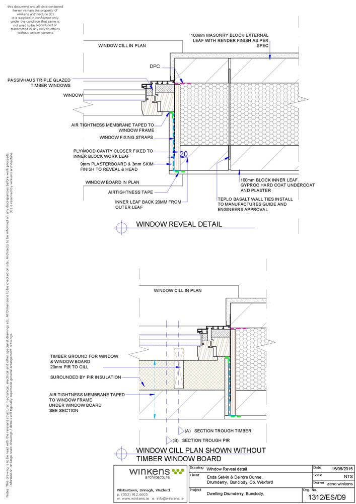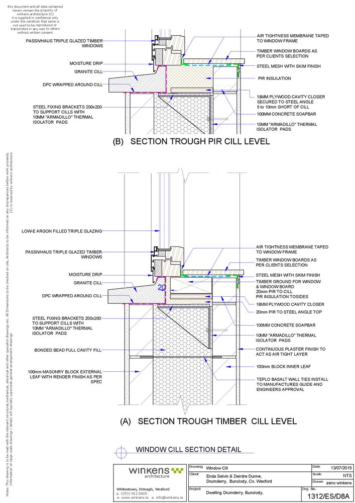 Thermal bridging: Mix of Irish ACDs, Quinn Lite certified details and bespoke details. First two courses of Quinn Lite blocks to inner leaf, low thermal conductivity TeploTie cavity wall ties. Calculated Y-factor (W/m2K): 0.019