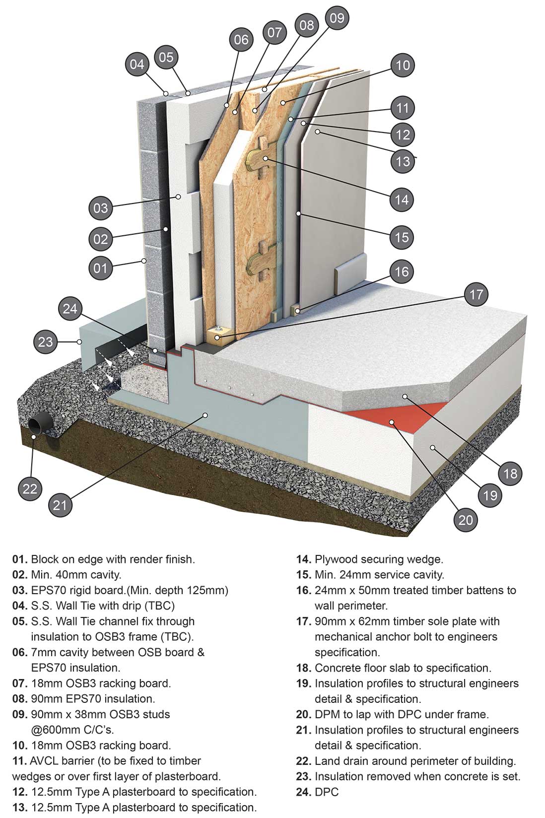 Walls (13B): Glavloc G Loc Zero external wall system, comprised of (variously) larch cladding on ventilated cavity or Parex Lanko render system; on 125 mm KORE platinum EPS70 external insulation; on Glavloc breather membrane, 18 mm OSB3 Glavloc racking board; 90 mm EPS70 wall insulation; 90 mm OSB3 Glavloc compression stud; 18 mm OSB3 Glavloc racking board; airtightness layer, 24 mm services cavity; 12.5 mm plasterboard. U-value: 0.14 W/m2K