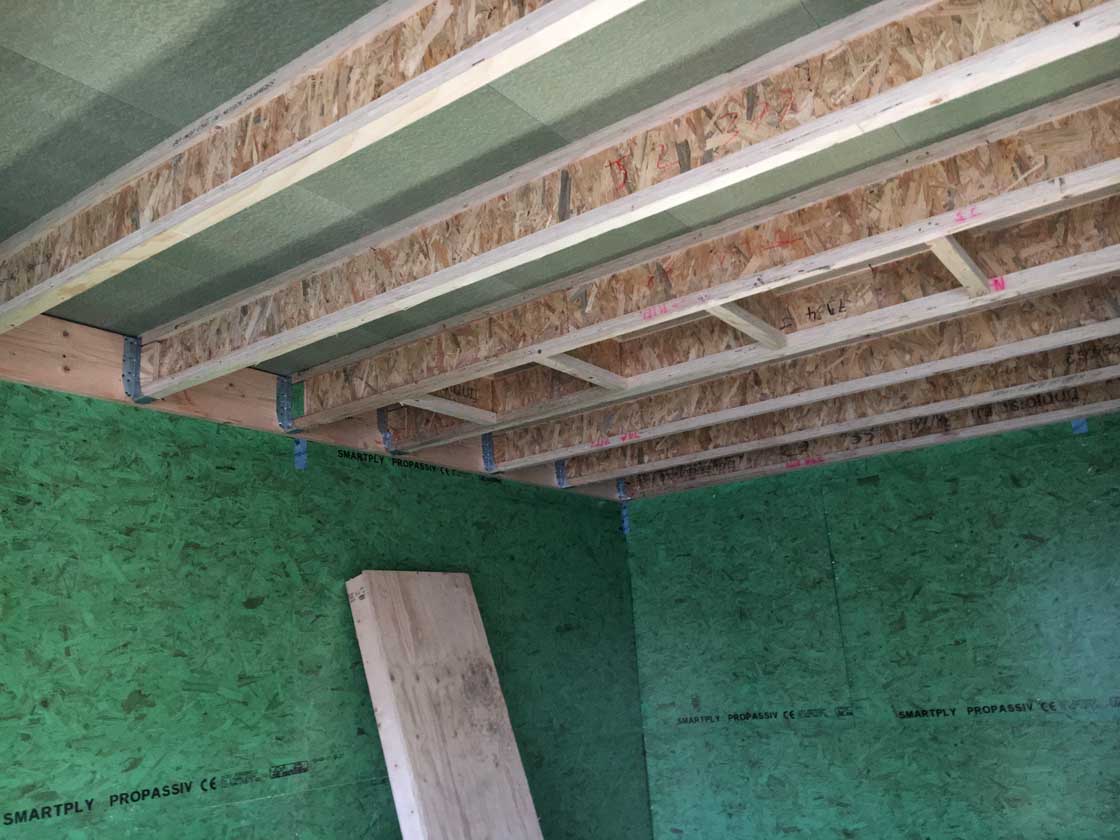 This build used a balloon frame (i.e. with a single wall rising through both storeys) so airtightness and insulation is continuous, and the first floor is hung off the walls. Insulation is at ceiling level, with a trussed roof above.
