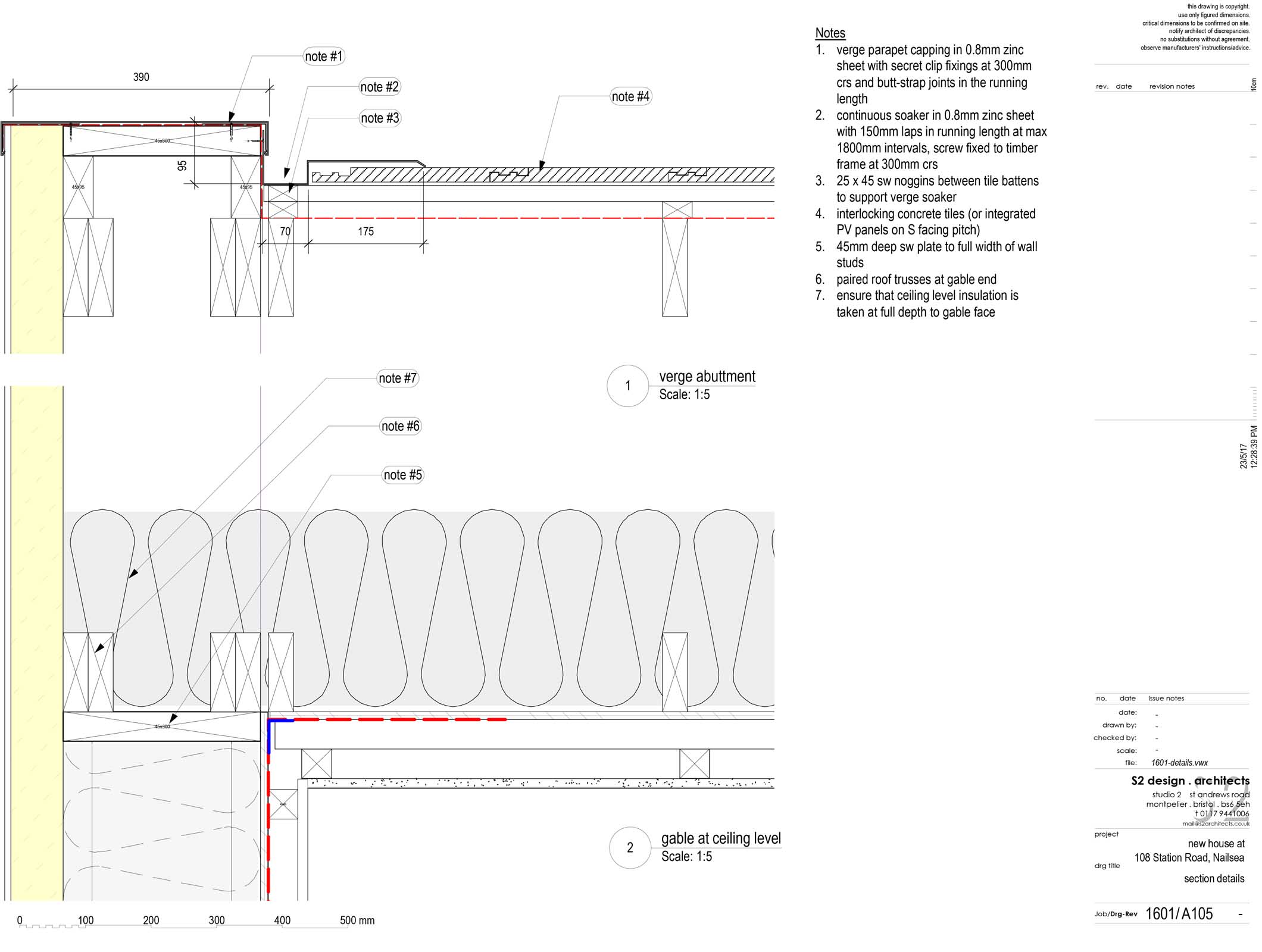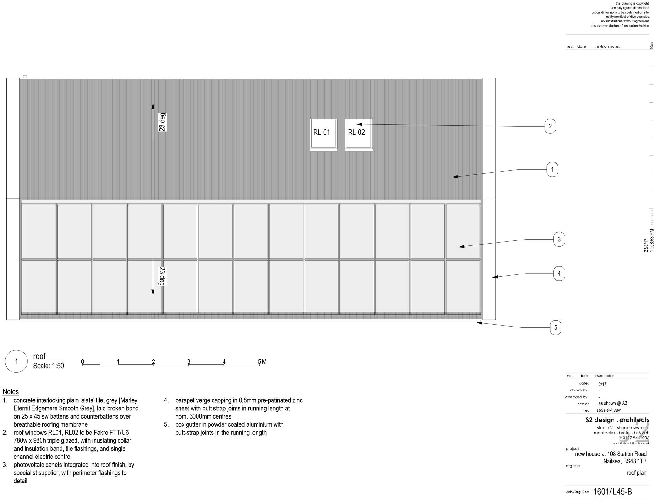 Trussed roof: GBSol roof integrated solar PV system to south roof; concrete tiles on breathable roofing membrane to north roof. 300 mm Warmcel on the flat, bridged by timbers at 10%, followed beneath by 12 mm ProPassiv OSB, 25 mm services cavity, 15 mm plasterboard and skim. Uvalue: 0.132 W/m2K