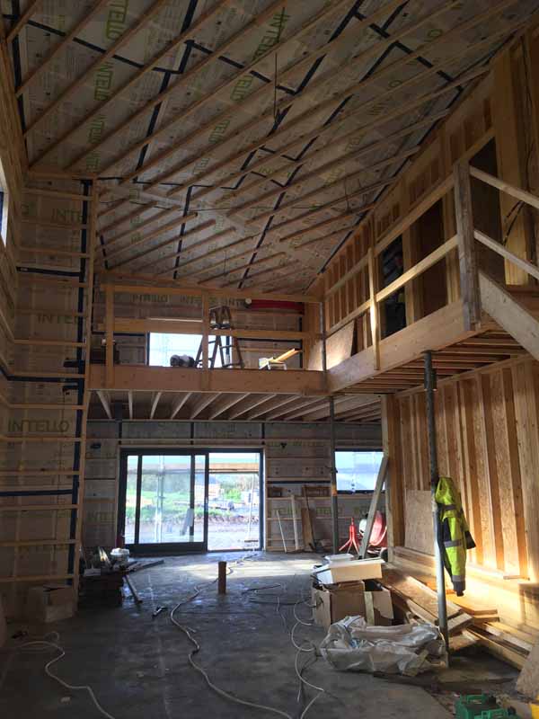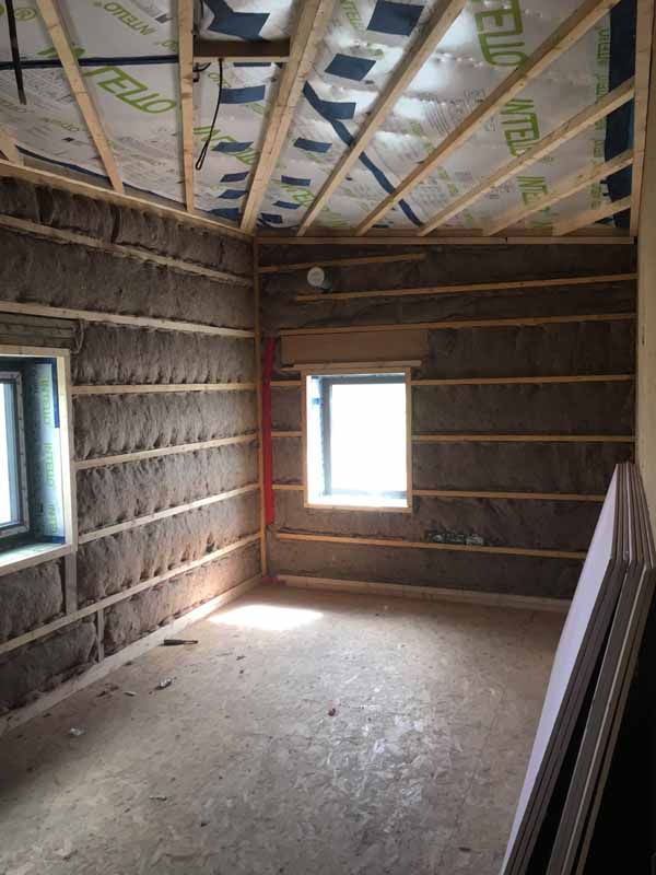 4 Sequence showing the build-up of the timber frame structure internally, with an Intello vapour control membrane and a service cavity insulated with Thermafleece sheep wool insulation