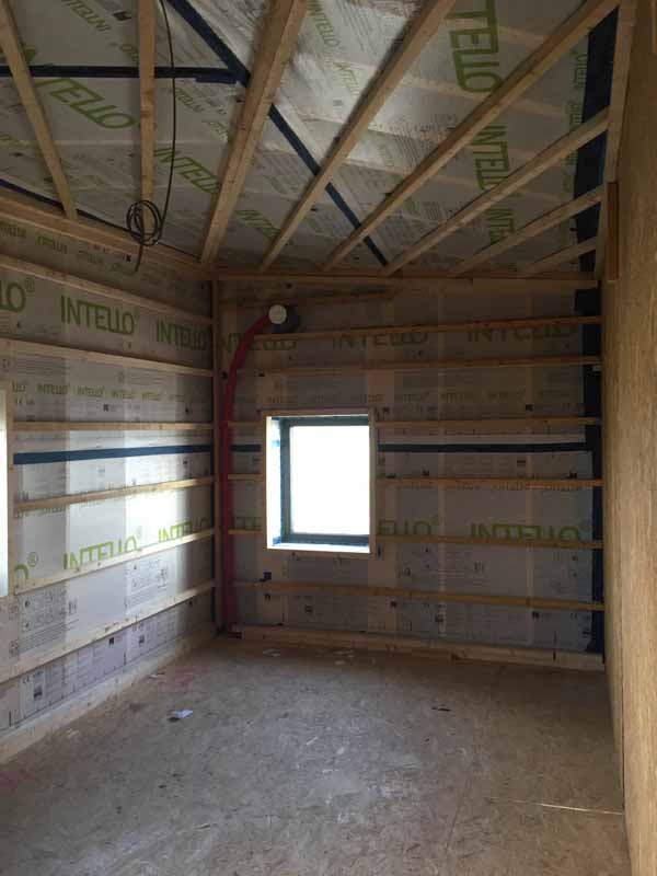 2 Sequence showing the build-up of the timber frame structure internally, with an Intello vapour control membrane and a service cavity insulated with Thermafleece sheep wool insulation