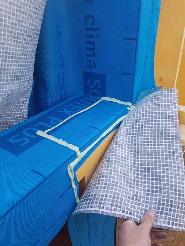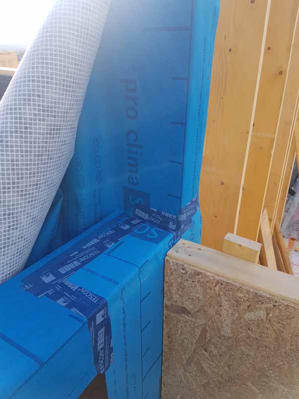 Airtightness sealing with pro clima Solitex Plus with continuous membrane running behind internal walls to minimise leakage