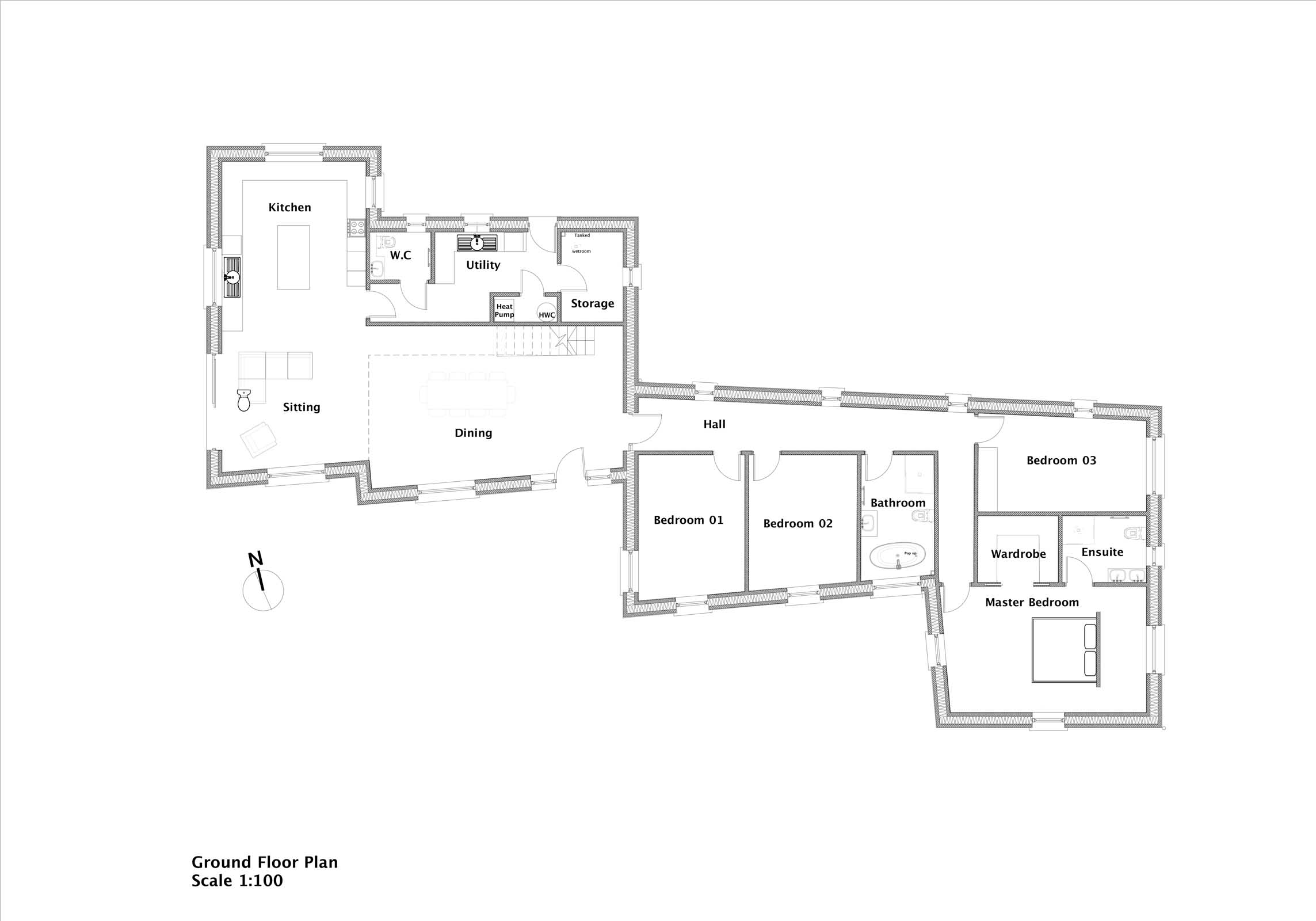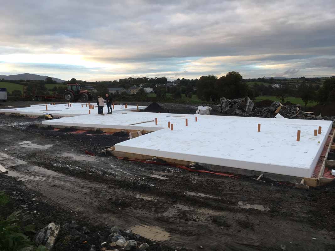 Ground floor: Insulated raft foundation with 200 mm EPS insulation. U-value: 0.100 W/m2K