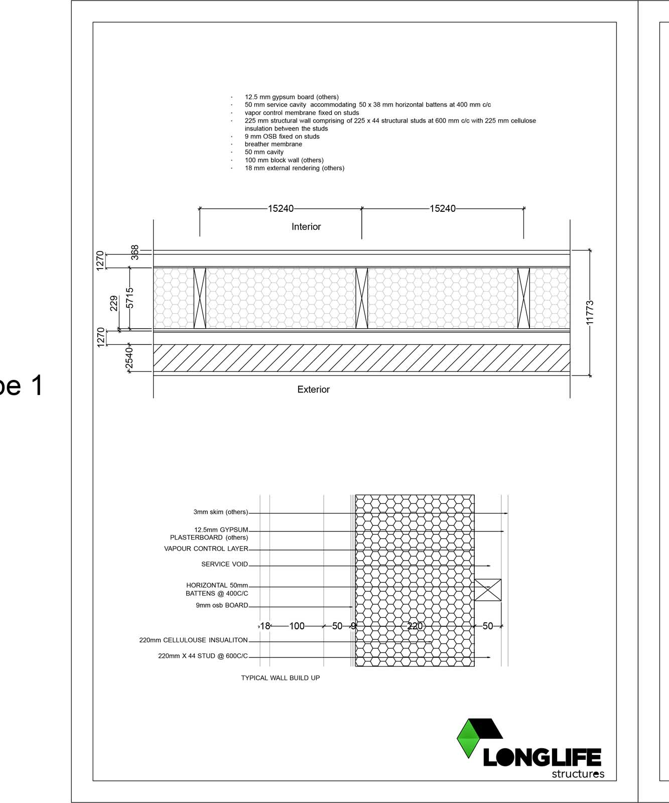 Walls: Factory-built timber frame with 100 mm rendered concrete blockwork externally, followed inside by pro clima Fronta WA membrane, 50 mm unventilated cavity, 9 mm plywood sheathing, 220 mm cellulose-filled timber stud, Intello airtightness membrane, 50 mm service cavity insulated with sheep wool insulation, and 15 mm Gyproc Soundbloc/Fireline/Moisture Resistance. U-value: 0.164 W/m2K (accounts for studs & battens)