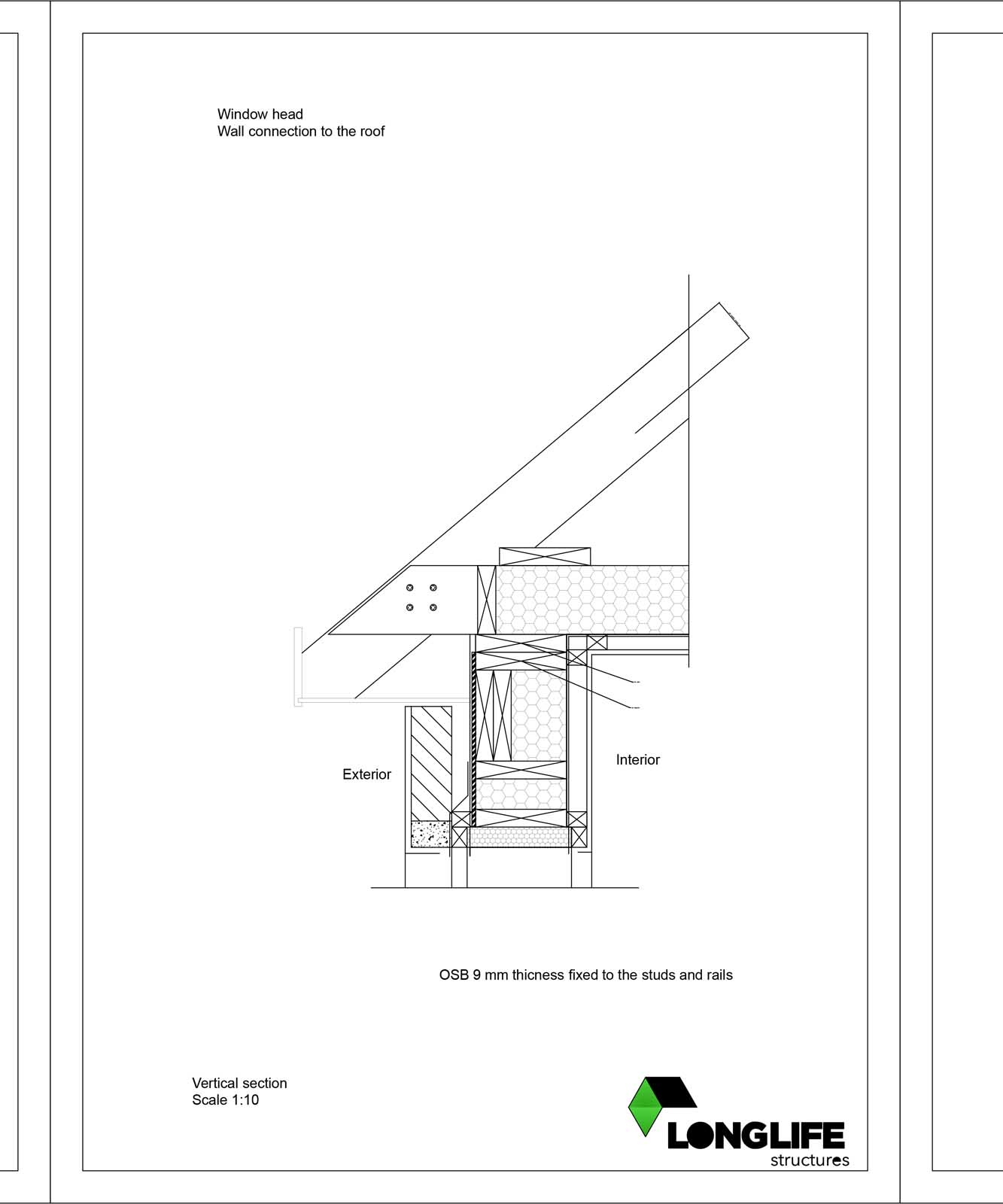 Roof: Alkor fully bonded PVC with seams, with Novaplex coated steel soffi t and fascia, followed beneath by 18 mm plywood sheathing, 38 mm ventilated cavity, pro clima Solitex Plus membrane, 300 mm timber I-joists fully filled with cellulose insulation, Intello airtightness membrane, 50 mm uninsulated service cavity, 15 mm Gyproc Soundbloc/Fireline/Moisture Resistance. U-value: 0.136 W/m2K