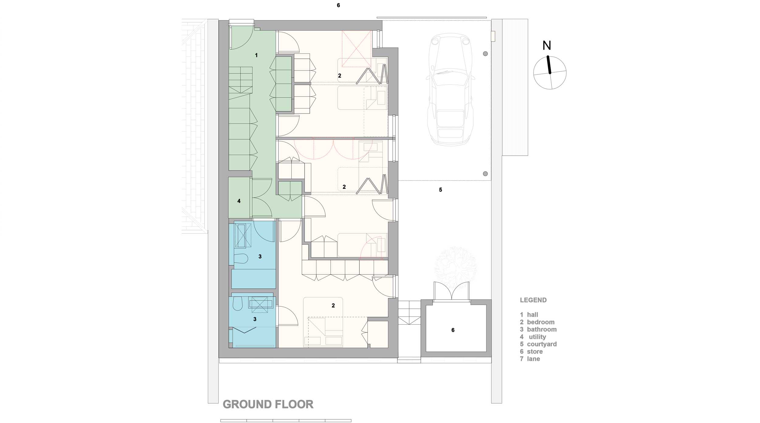 Green materials: 50% GGBS cement used in all insitu-concrete, aerated blockwork throughout with FSC certified timber in all areas. Biodiversity enhanced with the installation of ‘Living Wall’ and Acacia screen planting to upper level terrace along with mature specimen Magnolia at ground level. All ground surfaces are permeable along with re-surfaced lane which is water permeable asphalt.