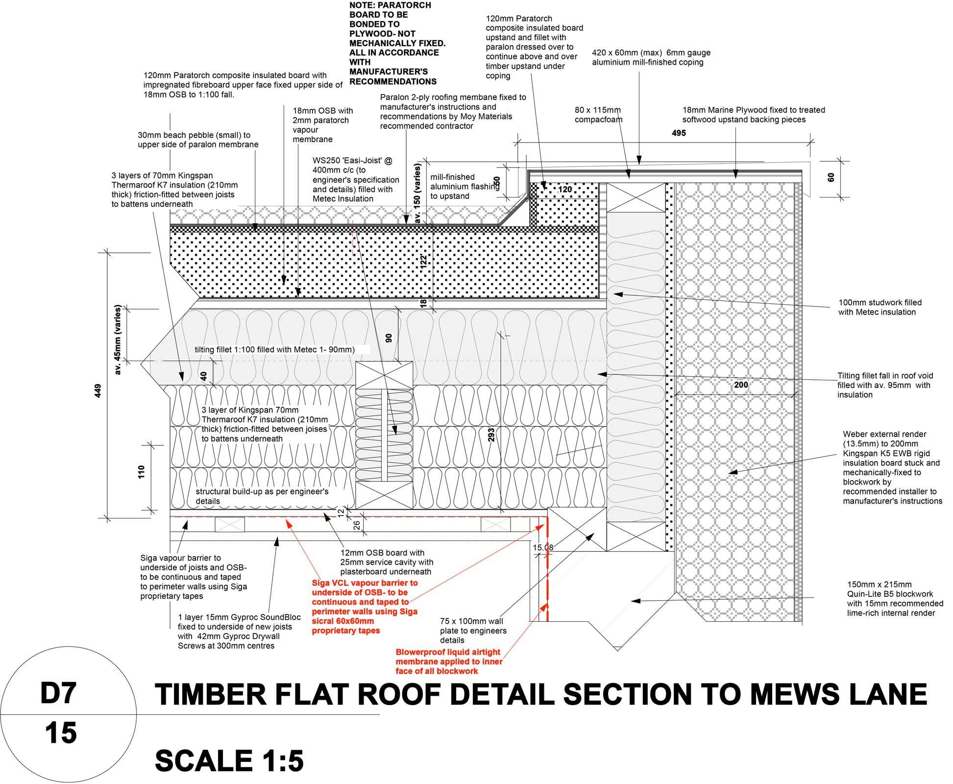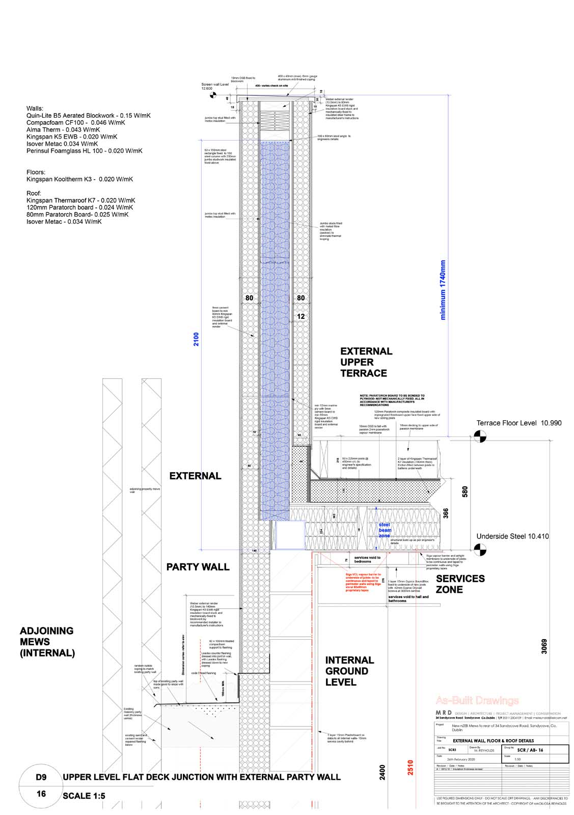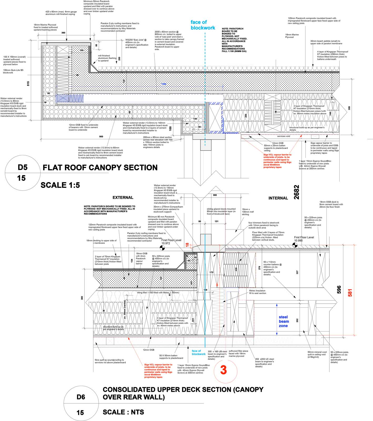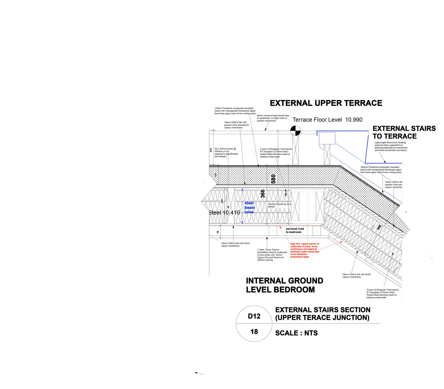 Roof and upper deck: Paralon NT4 2 ply roofing membrane, on 120 mm Paratorch insulated board, on 18 mm OSB, on timber joists with 15-90 mm Isover Metac mineral wool insulation on 210 mm infill Kingspan Kooltherm K7, on 15 mm OSB board to underside, on 25 mm service cavity, on 12.5 mm plasterboard. U-value: 0.1 W/m2K
