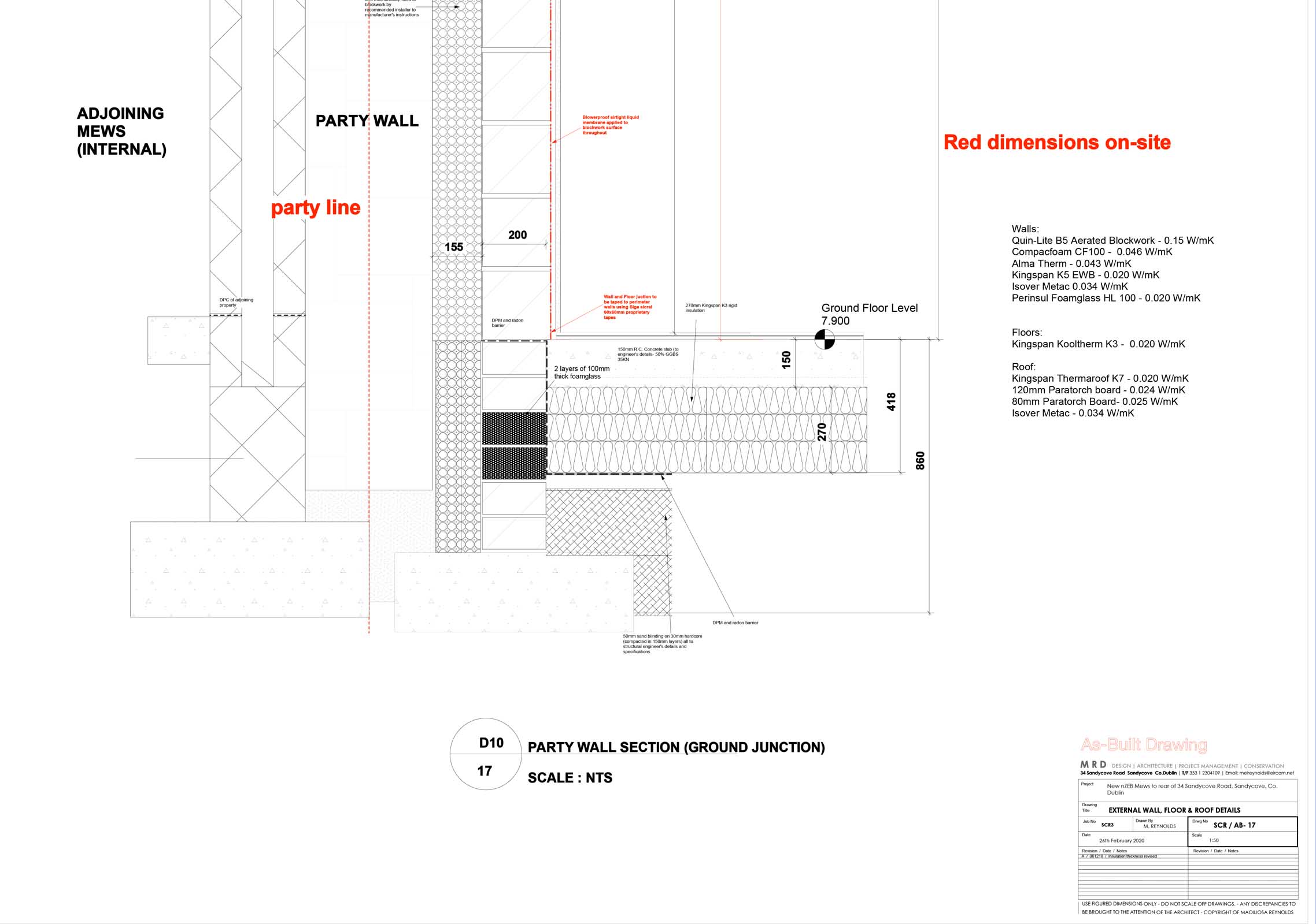 Walls generally: Acrylic external render externally on 140 mm Kingspan Kooltherm external wall insulation, on 215 mm Quinn Lite B5 blocks, on 12.5 mm plaster, on 15 mm dabs internally. U-value: 0.12 W/m2K North wall: Acrylic external render on 200 mm Kingspan Kooltherm external wall insulation, on 215 mm QuinLite B5 blocks, on 12.5 mm plaster, on 15 mm dabs internally. U-value: 0.09 W/m2K