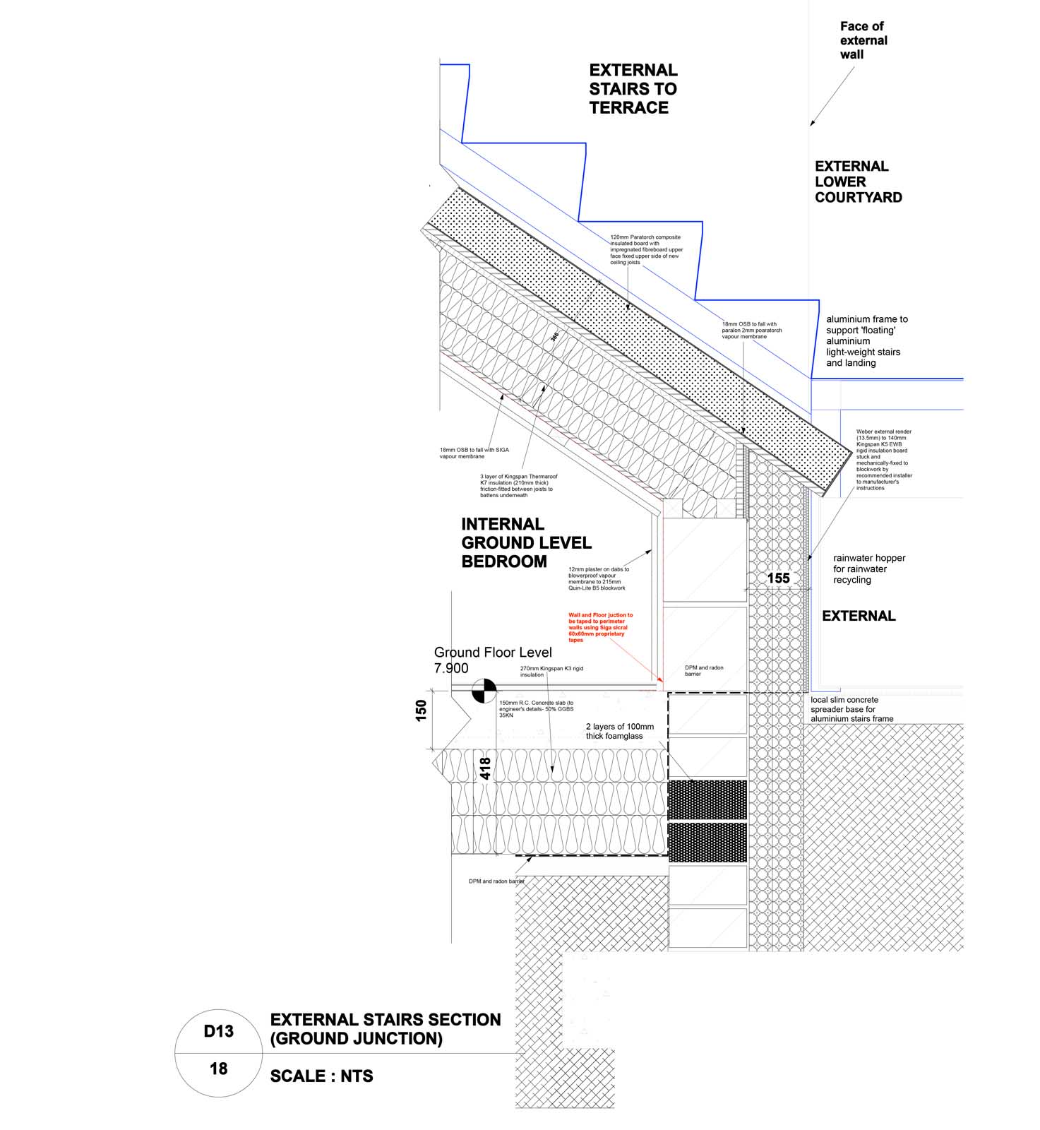 Airtightness: 0.57 air changes per hour at 50 Pascals Thermal bridging: Foamglas courses used in foundations to limit thermal bridging, Quinn Lite blockwork throughout with Compacfoam supports to window reveals (glazing positioned in external insulation zone), Alma-T to all thresholds below DPC level, Armadillo thermal-break pads to steel column connections. All service cavities filled with Metac insulation to reduce thermal looping. Letterbox and drainage all external to building envelope and garage gate externally mounted with no connections to building. Ground floor: 150 mm thick 50% GGBS reinforced concrete slab insulated with 270 mm Kingspan K3 insulation. U-value: 0.1 W/m2K