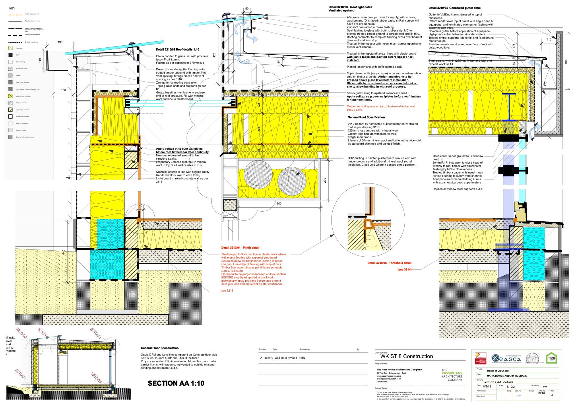 Roof: Ventilated zinc cold flat roof followed underneath by 45 mm Gutex Multitop, 18 mm Smartply, 340 mm Isover Spacesaver mineral wool, pro clima Intello membrane, 88 mm service cavity with mineral wool. U-value: 0.103 W/m2K