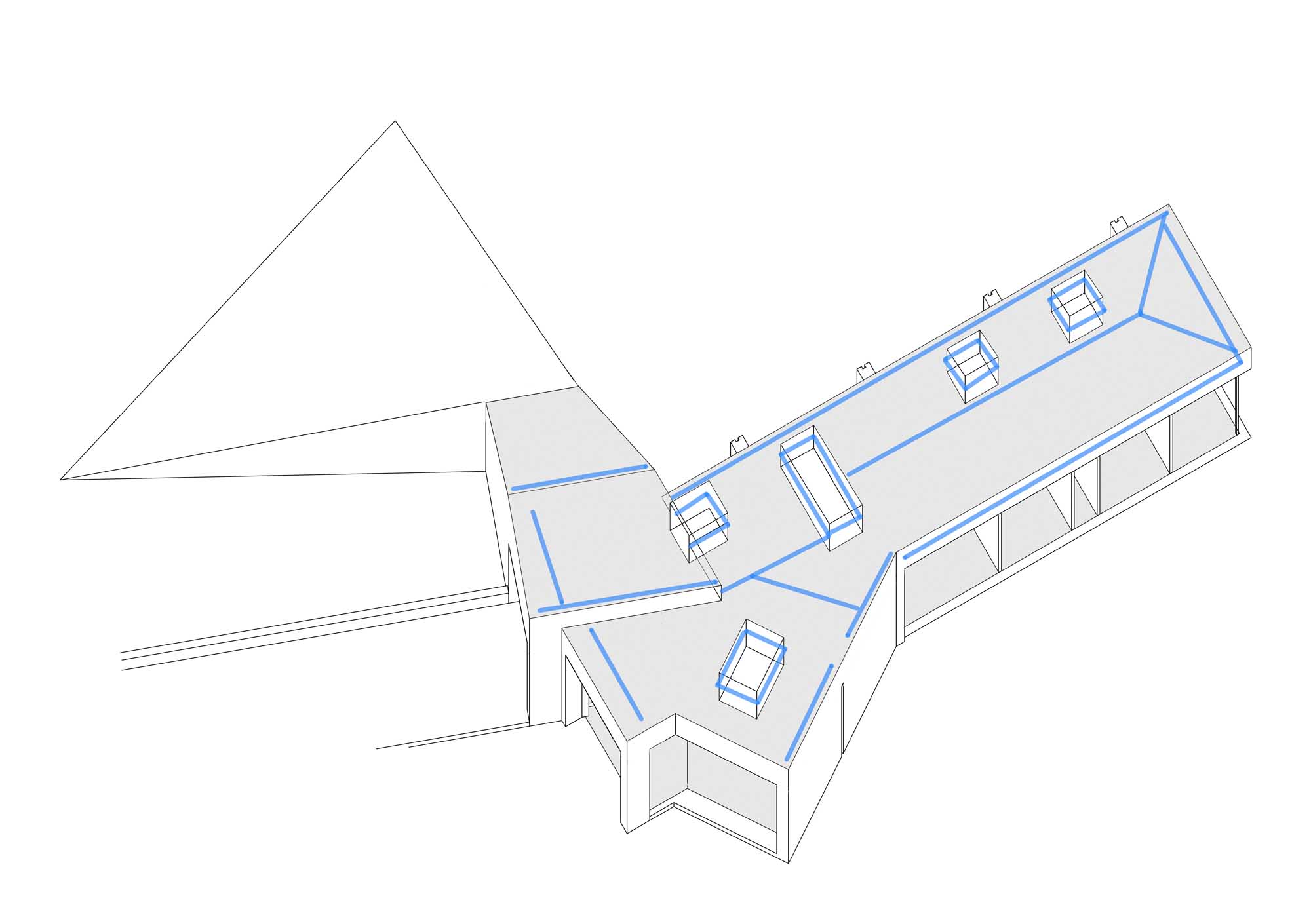 Roof windows: Triple glazed units custom manufactured by Precision Quality Glass. Rainscreen at roof level. U-value: 0.8 W/m2K Heating system: Daikin Altherma air-to-water heat pump, 180 litre hot water tank with COP of 6.11 for space heating (35-degree flow rate) and 2.52 on domestic hot water