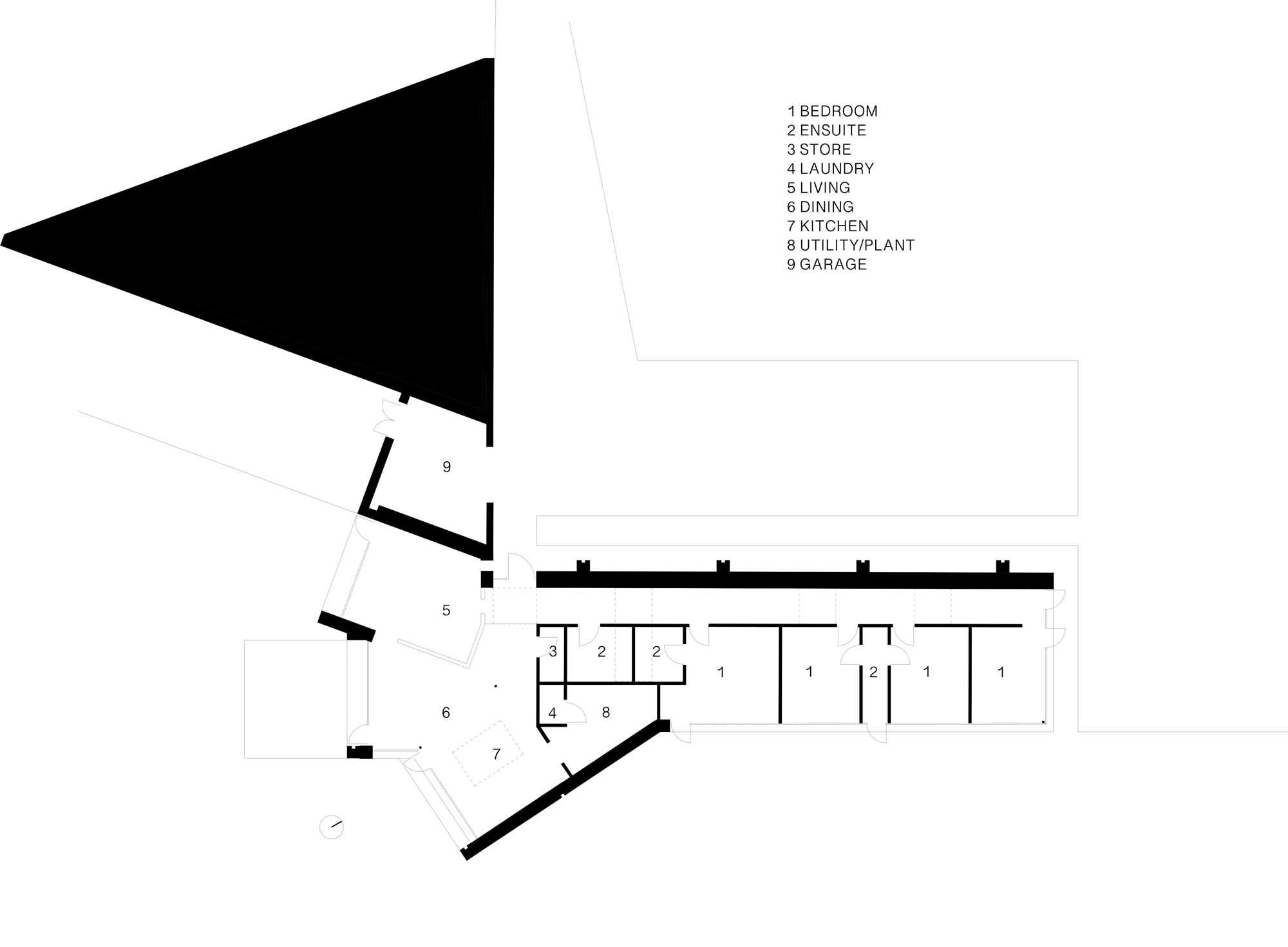 As you walk in, there’s the ‘singly loaded’ corridor to the left, which is on the other side of the blank entrance wall. The corridor runs north to south with roof lights over it and is bookended by a large window, with bed rooms all facing east to capture the morning sunshine. Once inside you’re also quickly enveloped by the open plan area, with floorto- ceiling glazing on three different facades each facing in various angles to the south and southeast, as well as massive roof lights above.