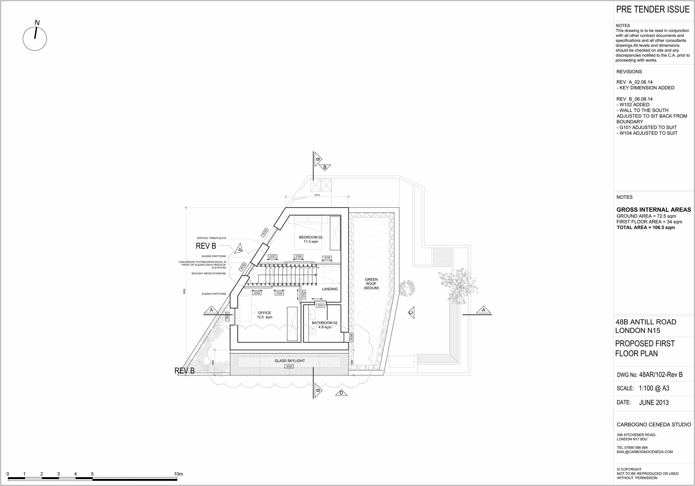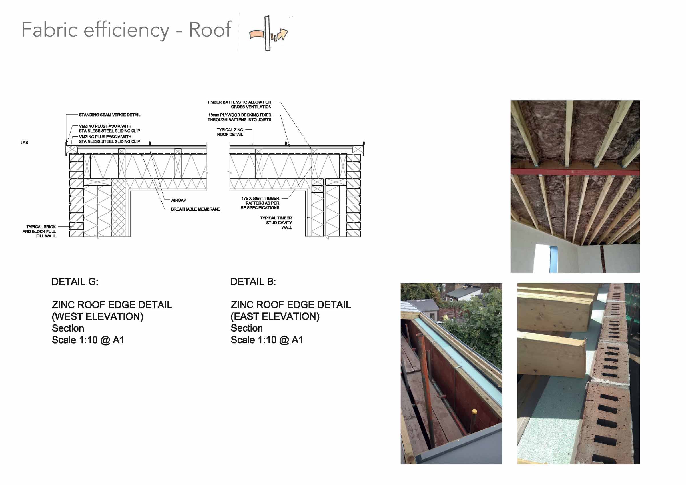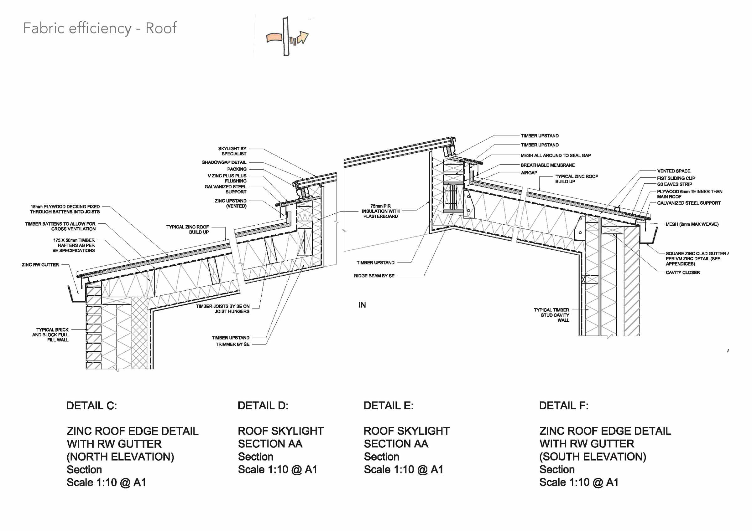 Main roof: Standing seam zinc roof externally, followed underneath by weatherproof roof membrane, 22 mm softwood sheathing boards, 50 mm ventilation gap with 50 mm x 50 mm purlins, 175 mm Knauf Earthwool rafter roll within rafters, 75 mm Knauf PIR laminate, 12.5 mm plasterboard to ceiling. U-value: 0.13 W/m2K