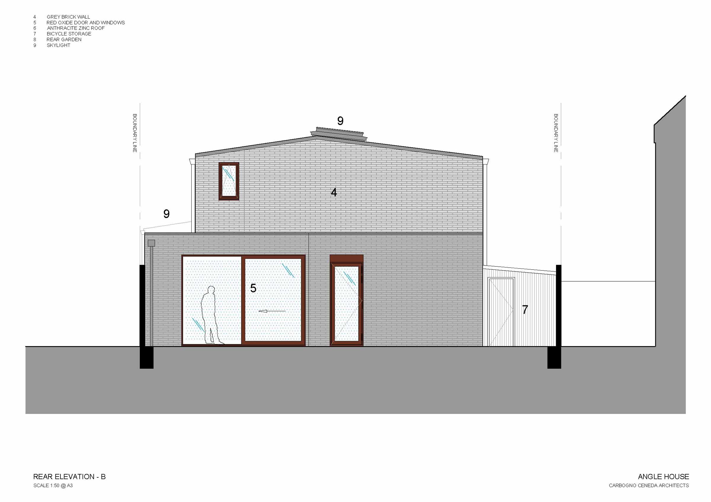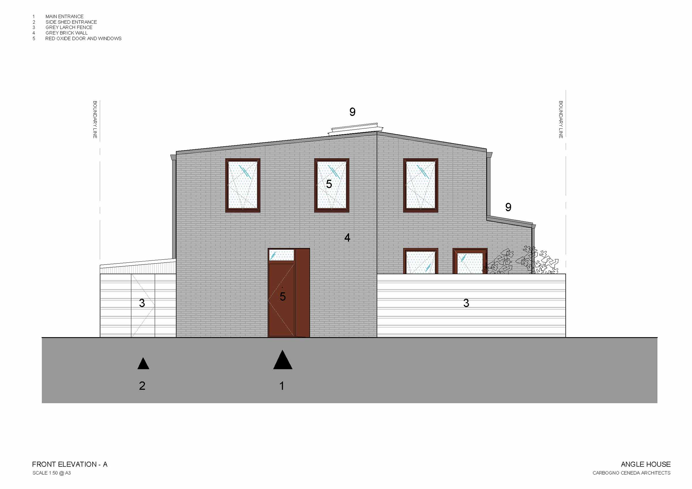 The road is L-shaped, and the house lies at the short end. It’s the only home on that side fronting the street. Immediately to the left, there is a terraced house, and to the right, there is a row of houses. The planners wanted the couple to set the front of the house back from the road, but they saw this as being against urban design principles, and during a redesign they had to negotiate the extent of this setback. “It’s like extending the street of terraced houses by adding a new unit at the end, however the unit is pushed back due to the triangulated shape of the site, because it’s too narrow at the front. We replicated the gable wall geometry of the end terrace to our street elevation, so there’s continuity to the sequence of angled roofs. Our house is subservient to the terrace which, as a design strategy, helps comply with planning guidelines,” says Andrea.