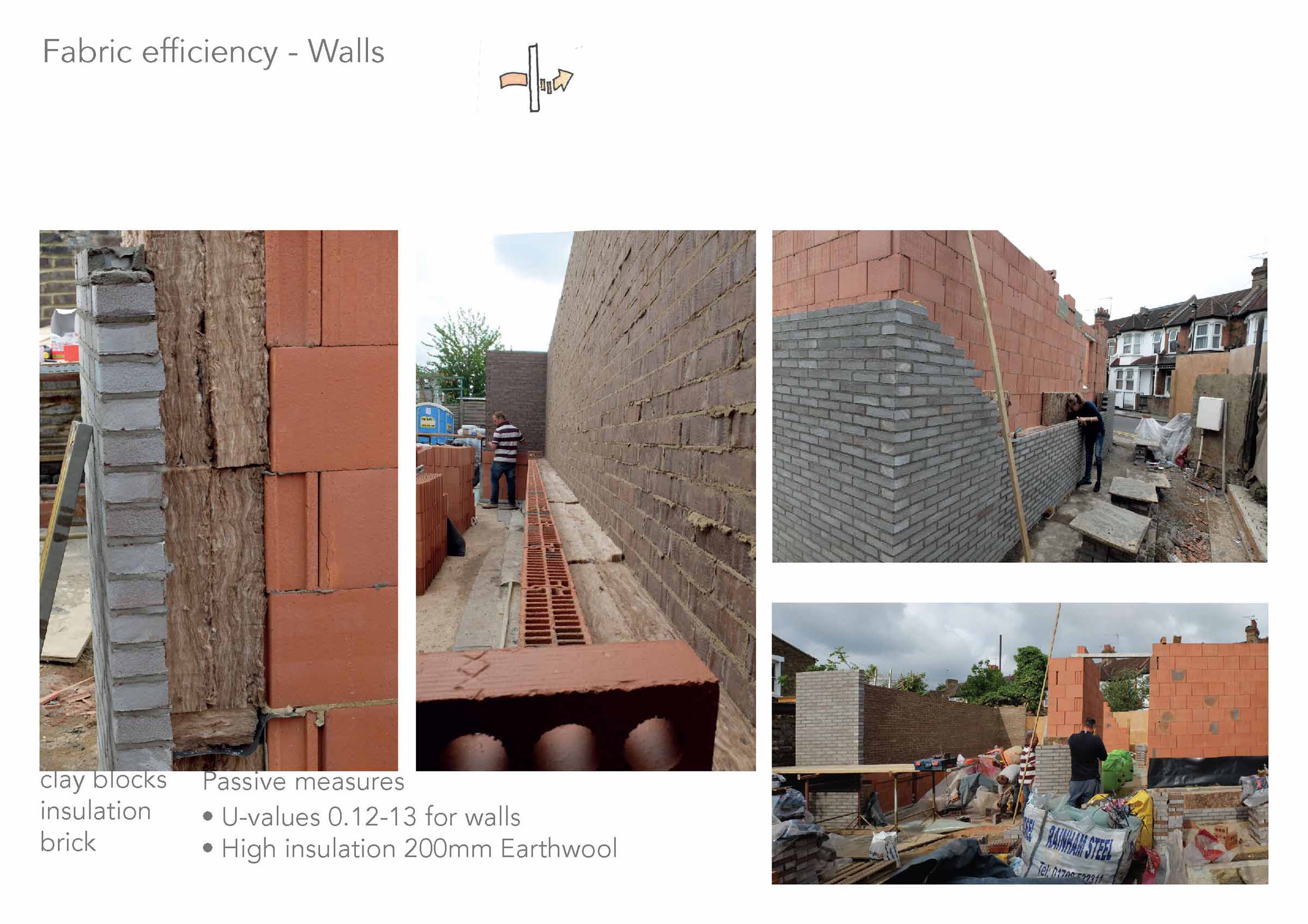 Ground floor (typical): 90 mm bricks externally, followed inside by Ancon basalt resin Teplo-L-Tie wall ties, 200 mm Knauf Earthwool DriTherm 32 slab insulation, 100 mm Porotherm clay blocks, 3 mm Porotherm Ecoparge, 2 x 12.5 mm plasterboards on dabs internally. U-value: 0.15 W/m2K