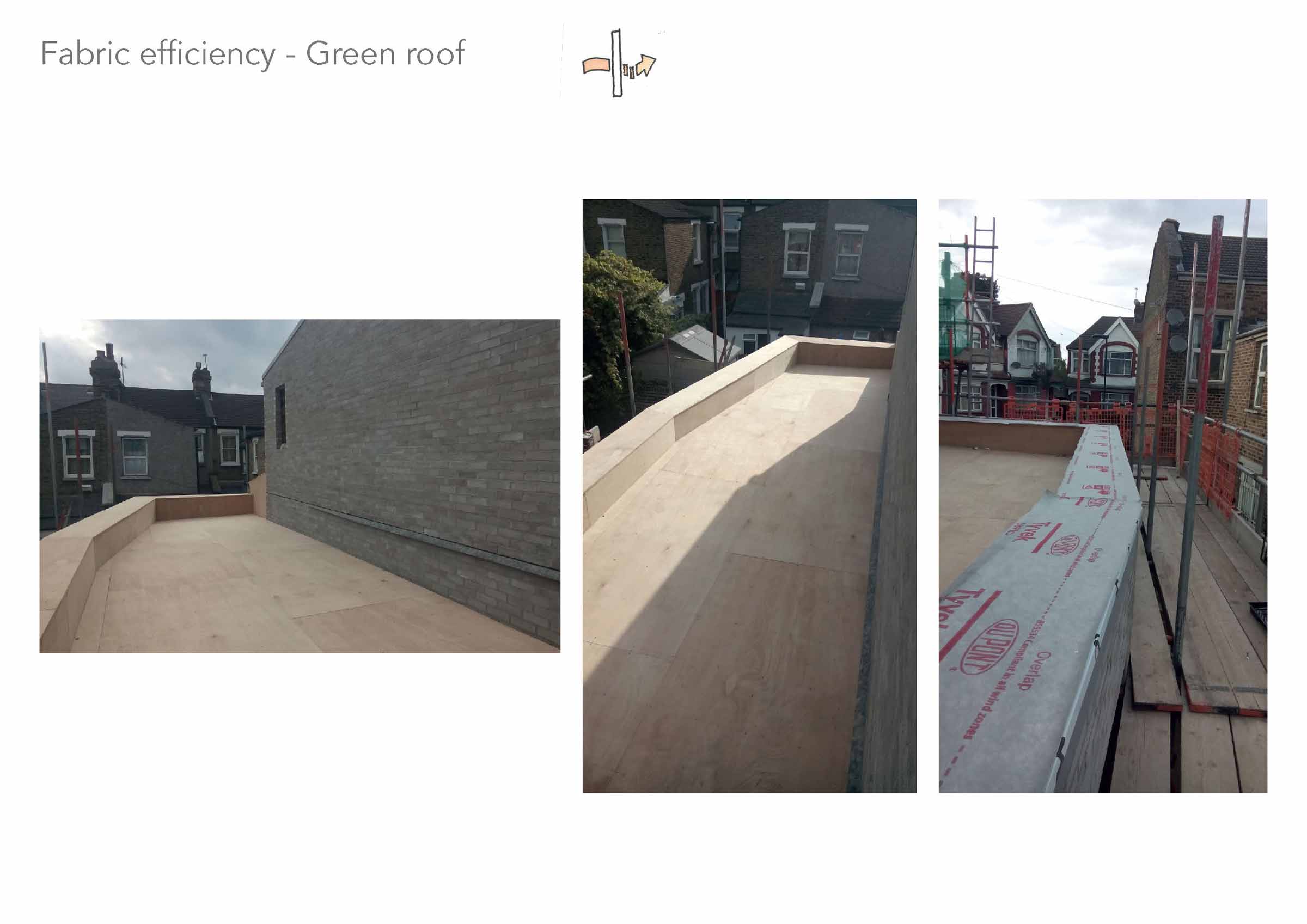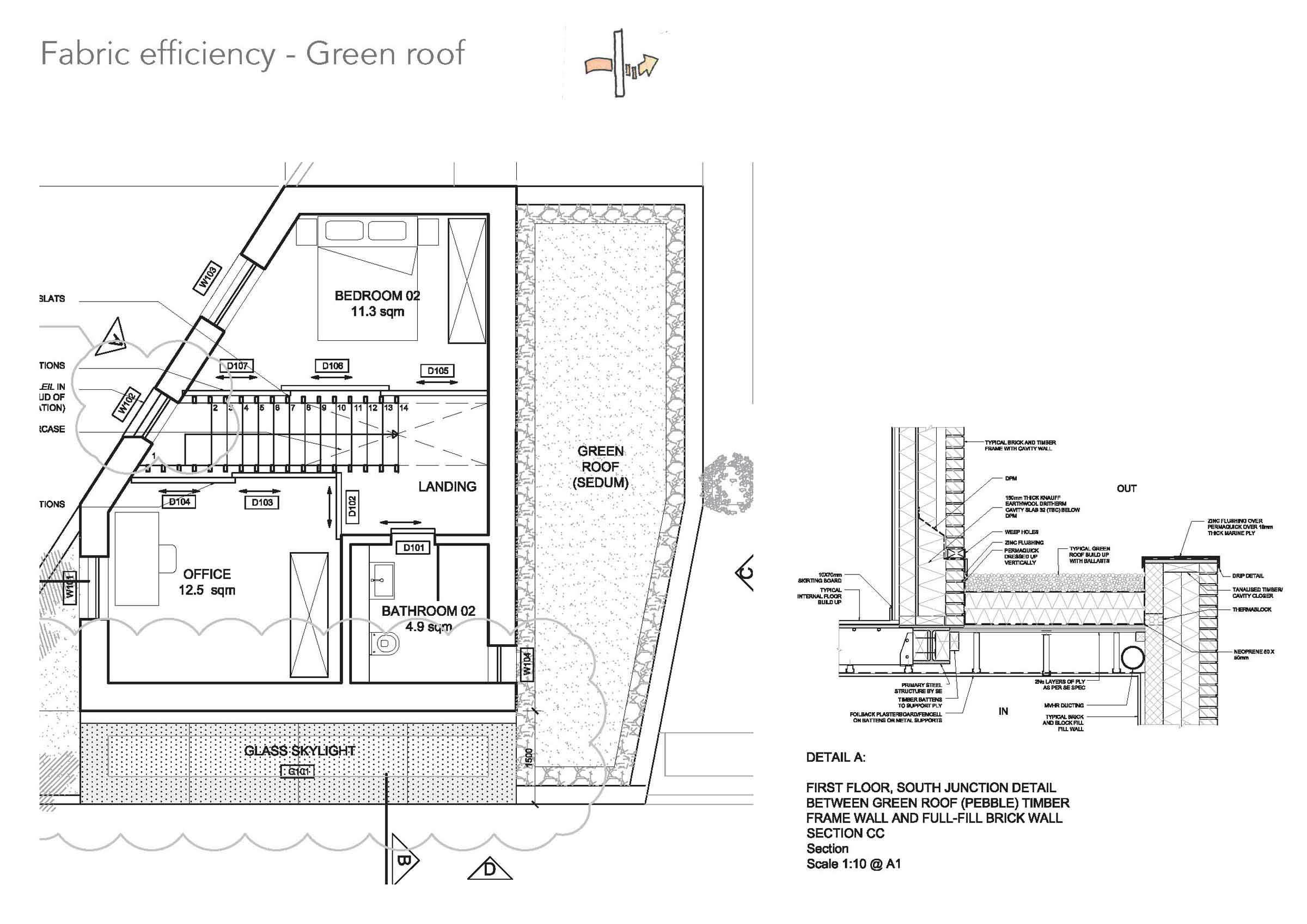 Flat green roof: Wildflower blanket externally, followed underneath by 100 mm growing medium, filter fleece, reservoir board, Ecomat, PE foil, waterproofing, 5 mm fiberglass, 18 mm PEFC marine ply, 160 mm Kingspan Styrozone insulation H350 R, 18 mm PEFC plywood, 50 x 200 mm deep timber joist. U-value: 0.13 W/m2K
