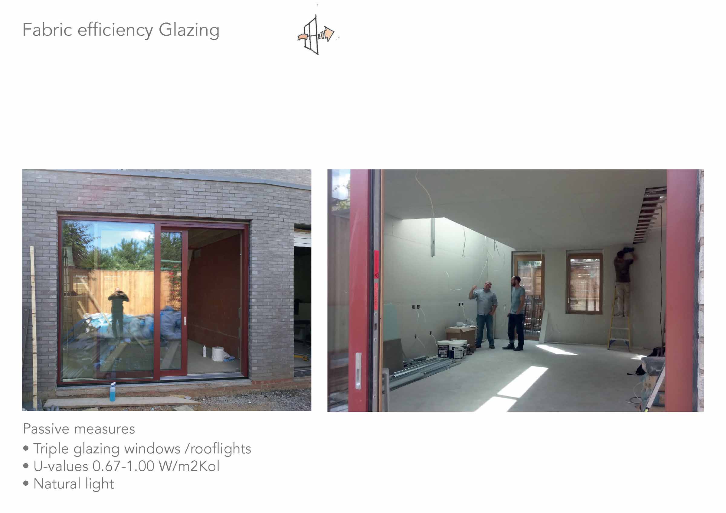 Roof windows: Abbey Glass triple glazed low emissivity broken powder coated aluminium perimeter frames: U-value: 0.75 W/m2K & 1.0 W/m2K.