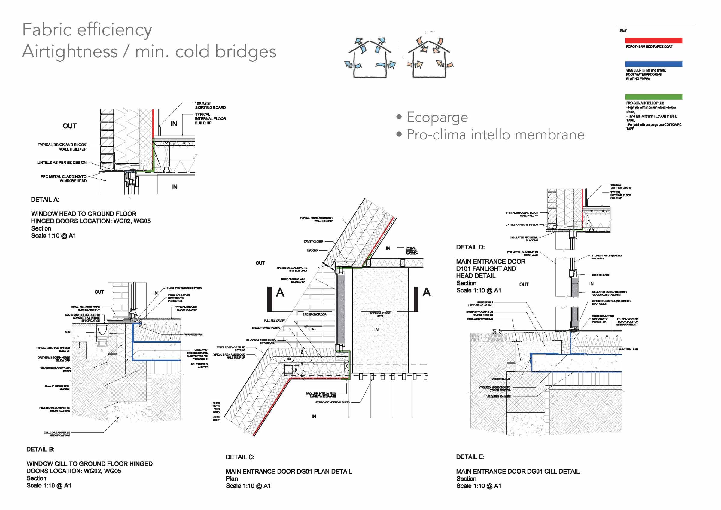 Thermal bridging: Use of low thermal conductivity Ancon Teplo-L-Ties wall ties, thermally broken window frames, Marmox thermal blocks. Y-value: 0.0776 calculation based on construction details and ACDs.