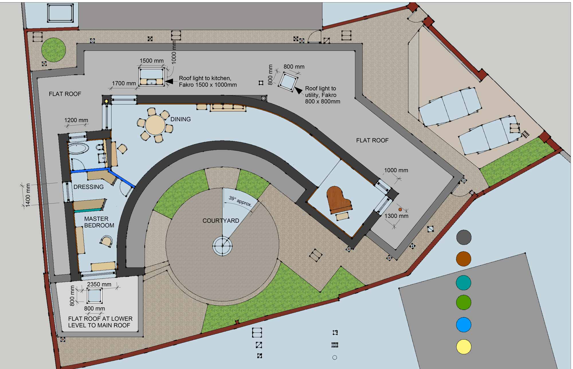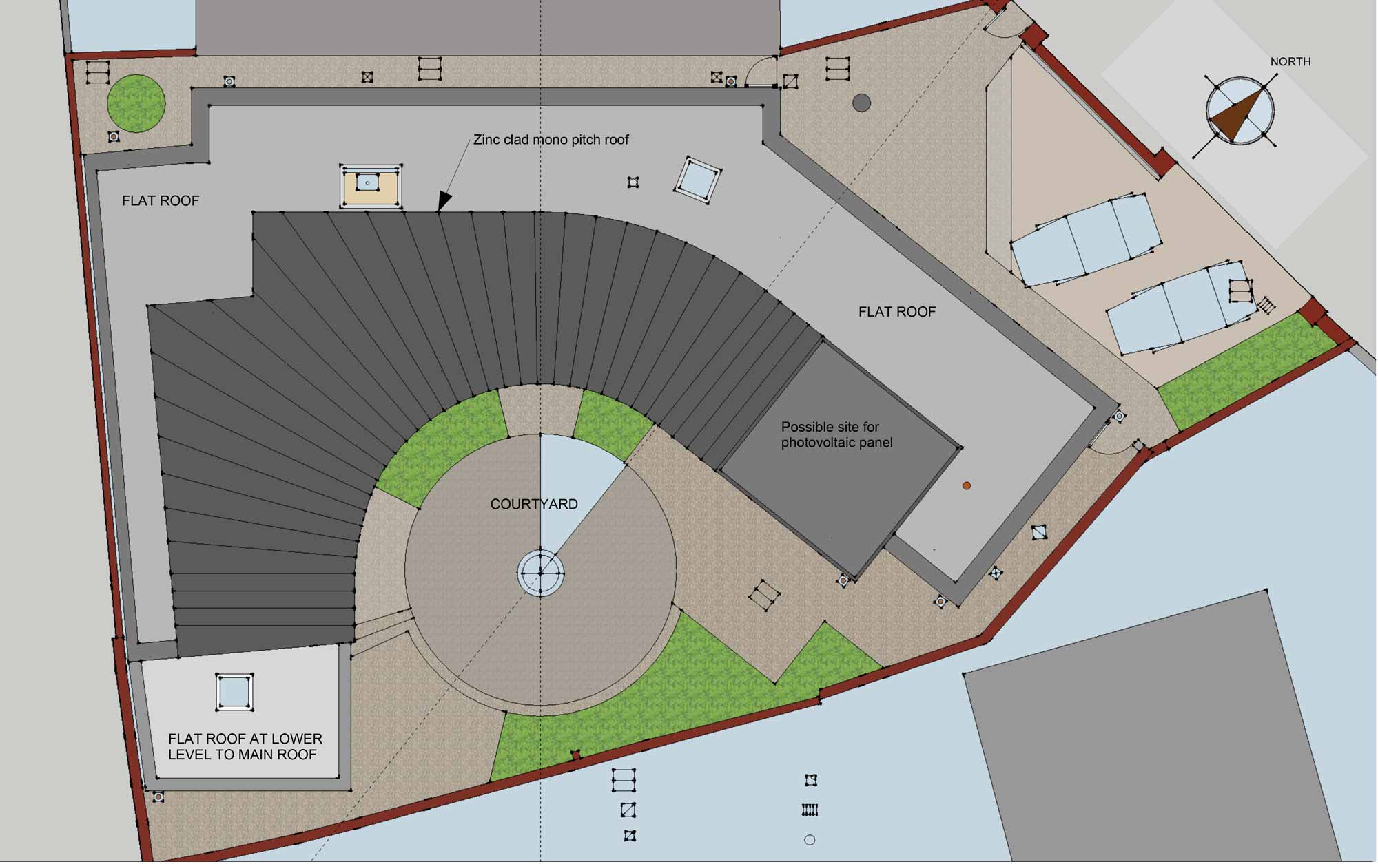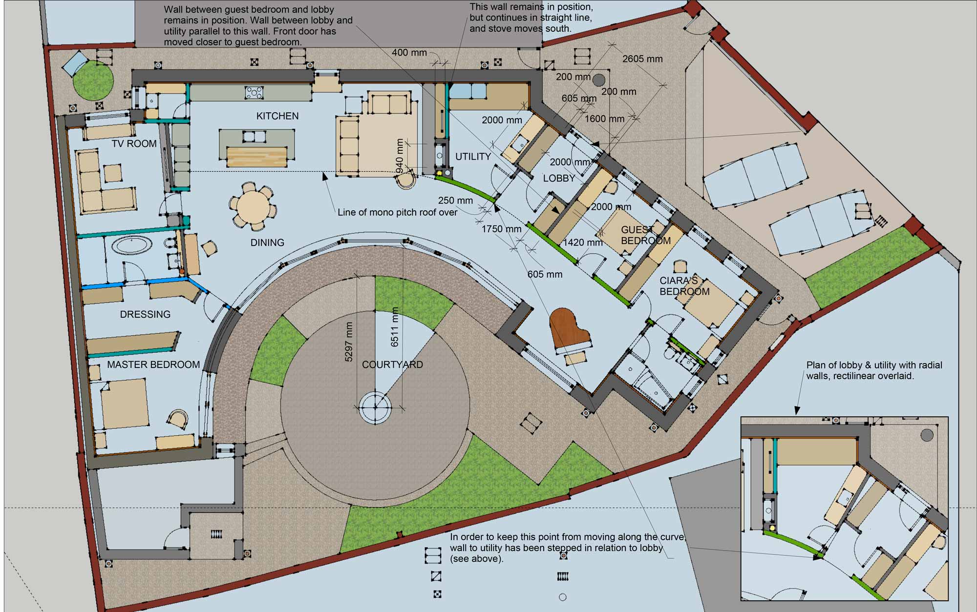 It sweeps around in a curve, getting wider to accommodate high level windows above the kitchen and bathroom. All this, along with the curved courtyard window setting, generated a fair bit of “swearing” among the build team in its bid to make it all come together.