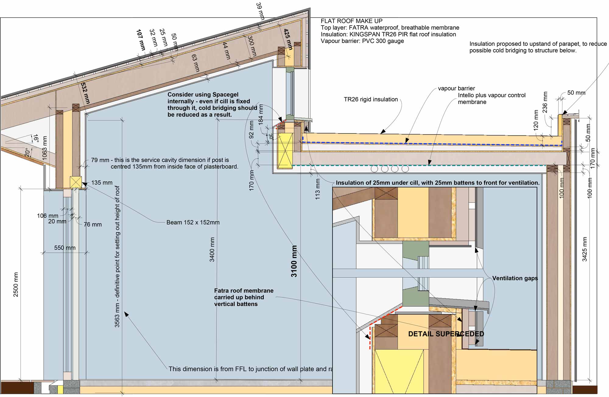 Roof, flat: Fatra PVC membrane, followed beneath by 120 mm TR 26 PIR insulation board, vapour barrier, 18 mm plywood sheeting, timber firring pieces falling from 92 to 50 mm (1 in 80 fall), joists 170 x 44 mm with full fill cellulose insulation, Intello Plus vapour control membrane, 100 x 38 mm battens at 400 mm c/c to form service cavity, 15 mm gypsum plasterboard and skim. U-value: 0.105 W/m2K