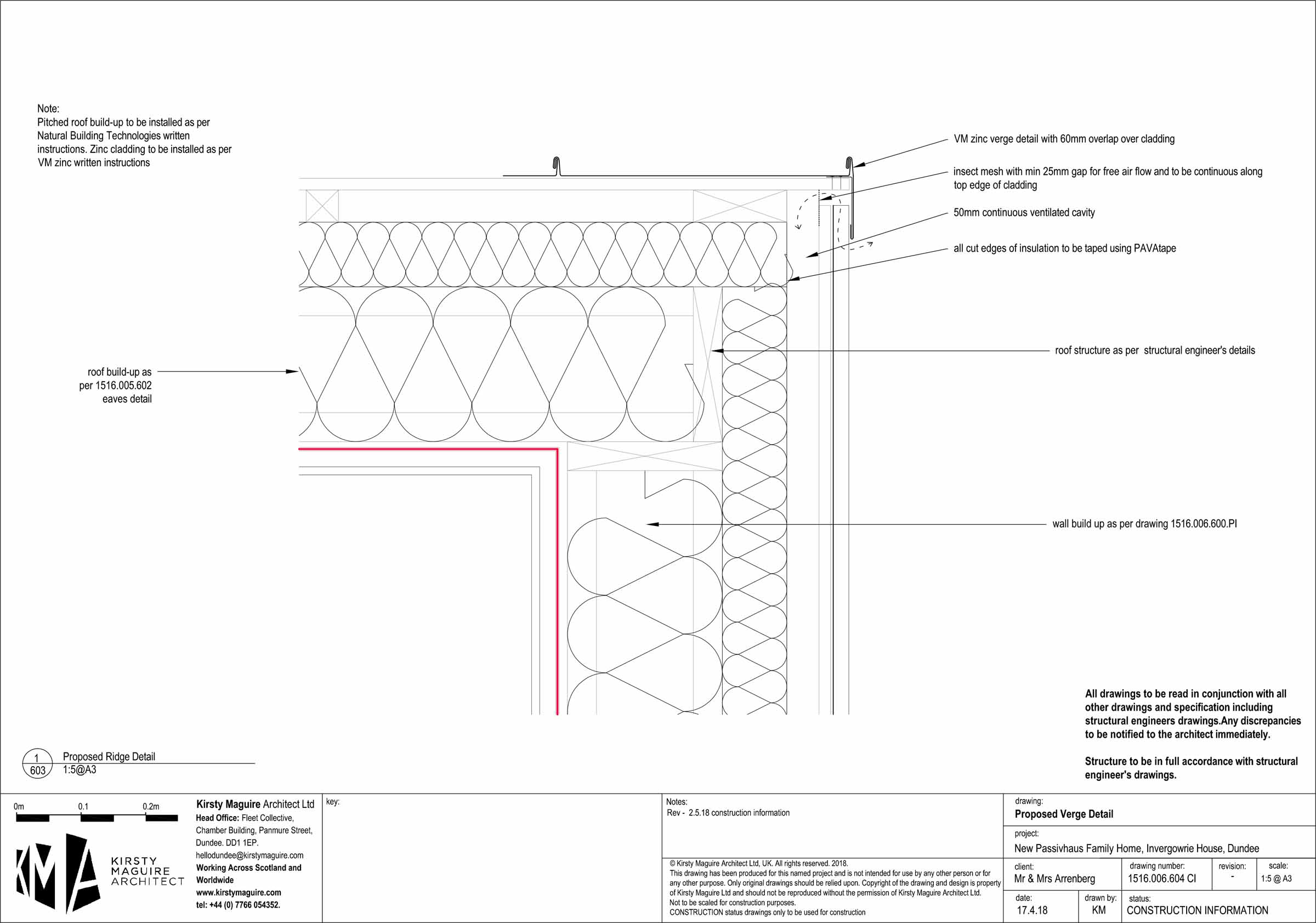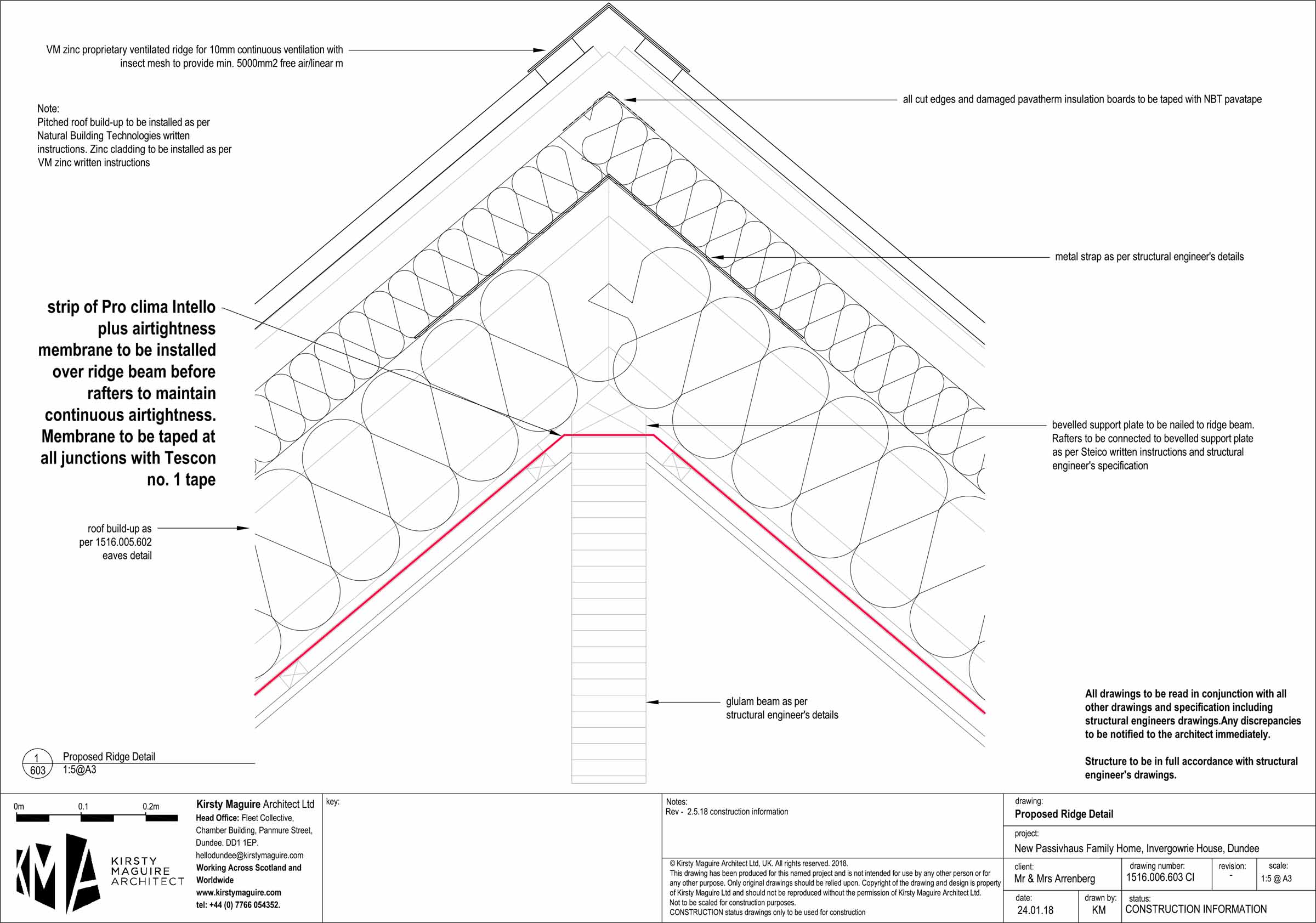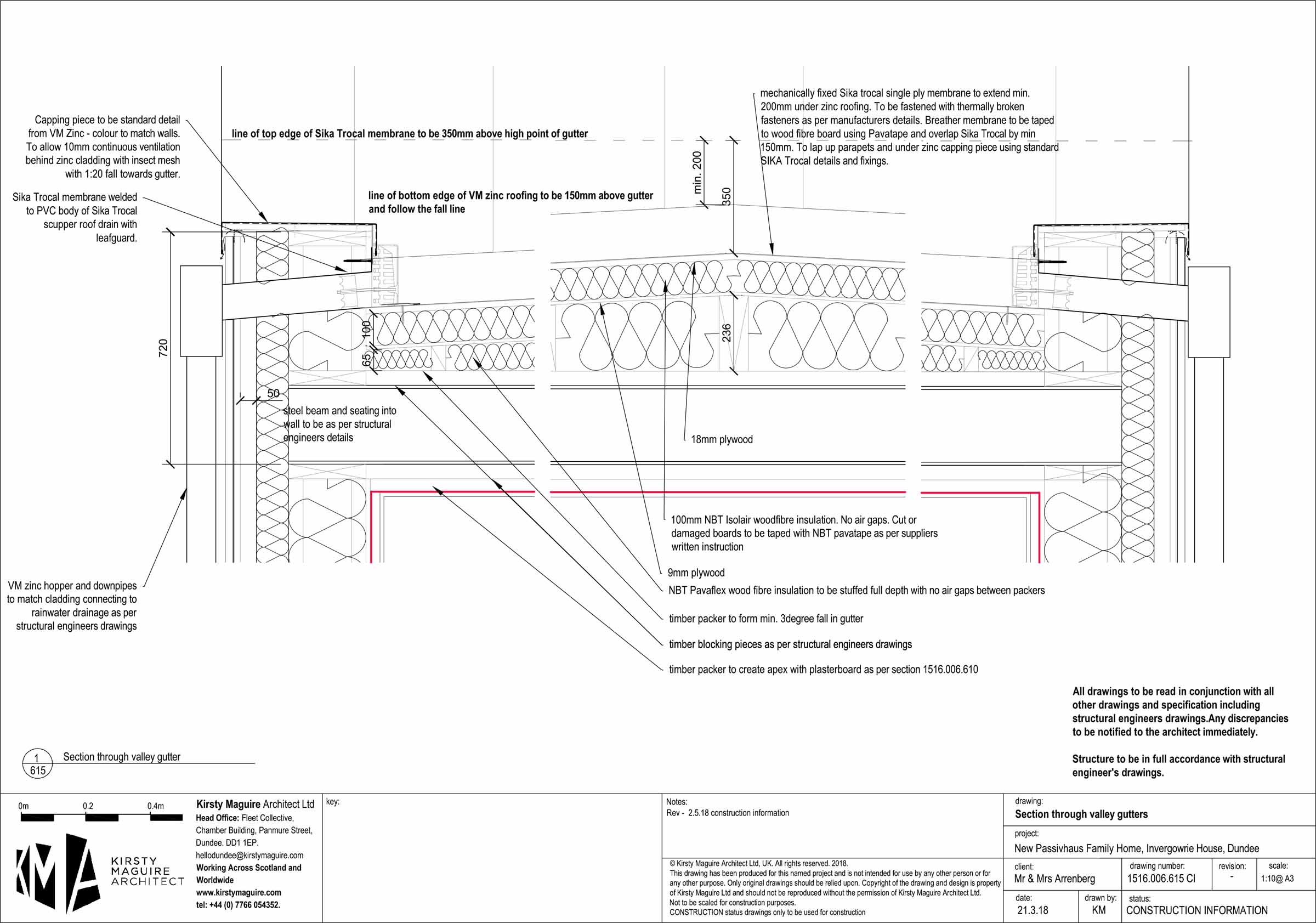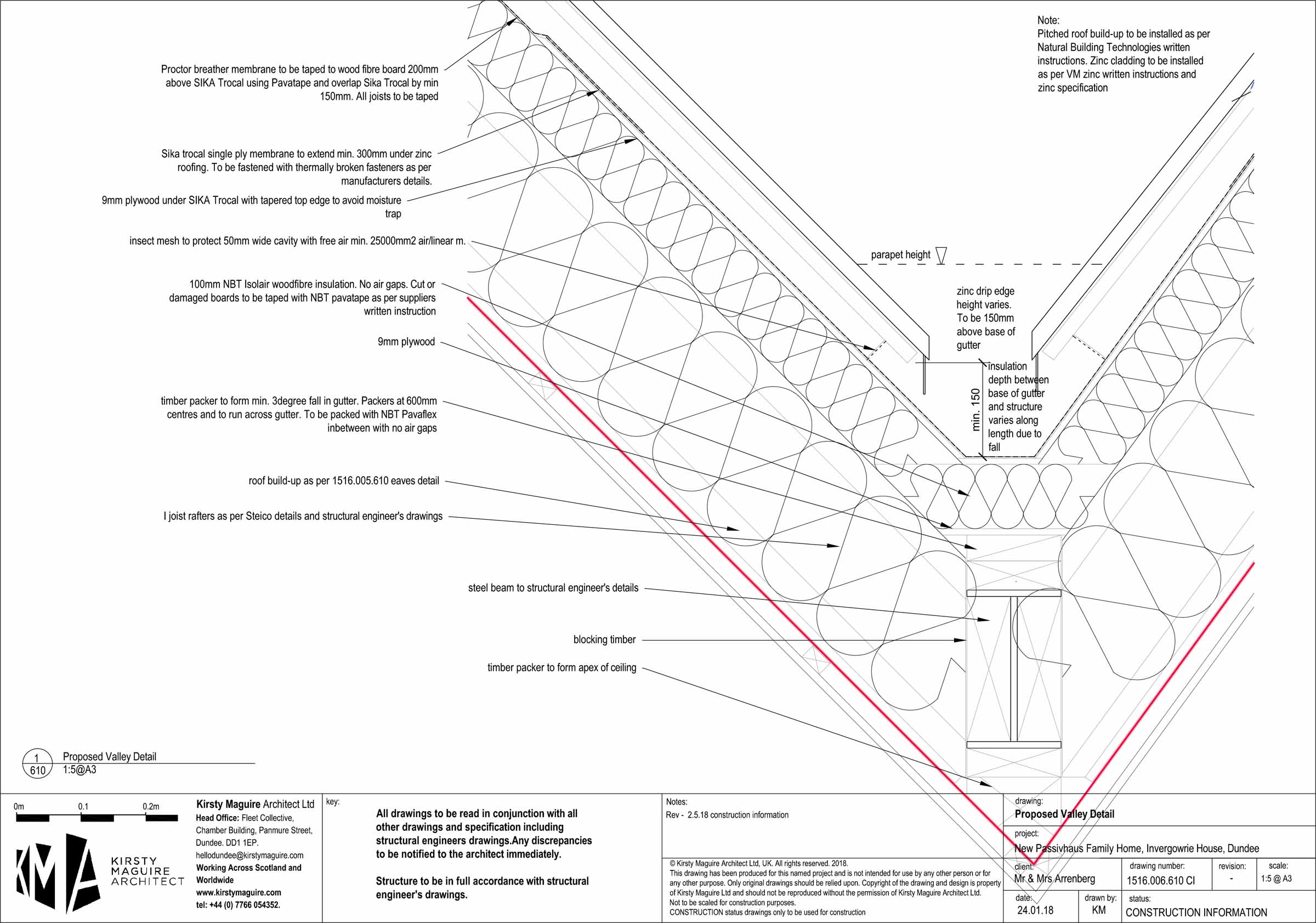 Roof: Zinc roofing, on 22 mm softwood sarking boards, on 50 mm ventilated cavity with 50x50 mm softwood boards, on 100 mm Steico wood-fibre board externally, followed beneath by 240 mm I joists stuffed with Steico wood-fibre batts, 12 mm OSB, Intello Plus airtightness membrane, 50 mm services cavity with softwood battens, plasterboard. U-value 0.116 W/m2K