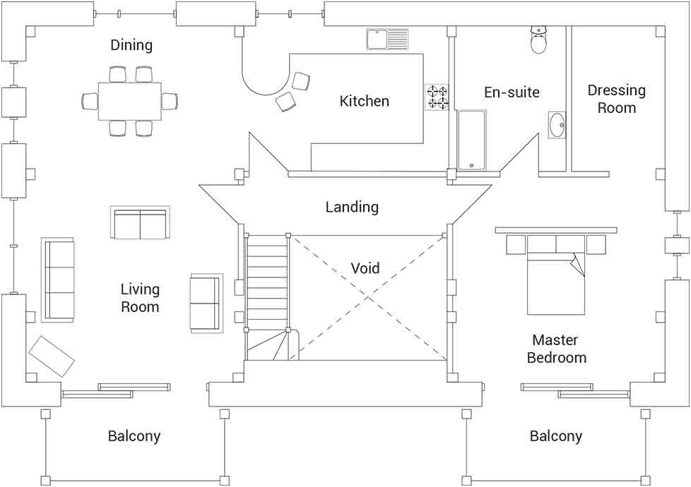 Andrew and Linda particularly enjoy having two balconies at the front. “They provide shading from the summer sun, but they make the house look more interesting. We frequently eat on one balcony and we’ve put comfortable chairs on the other one. It’s idyllic sitting there with a single malt enjoying the views across the fields,” says Andrew.