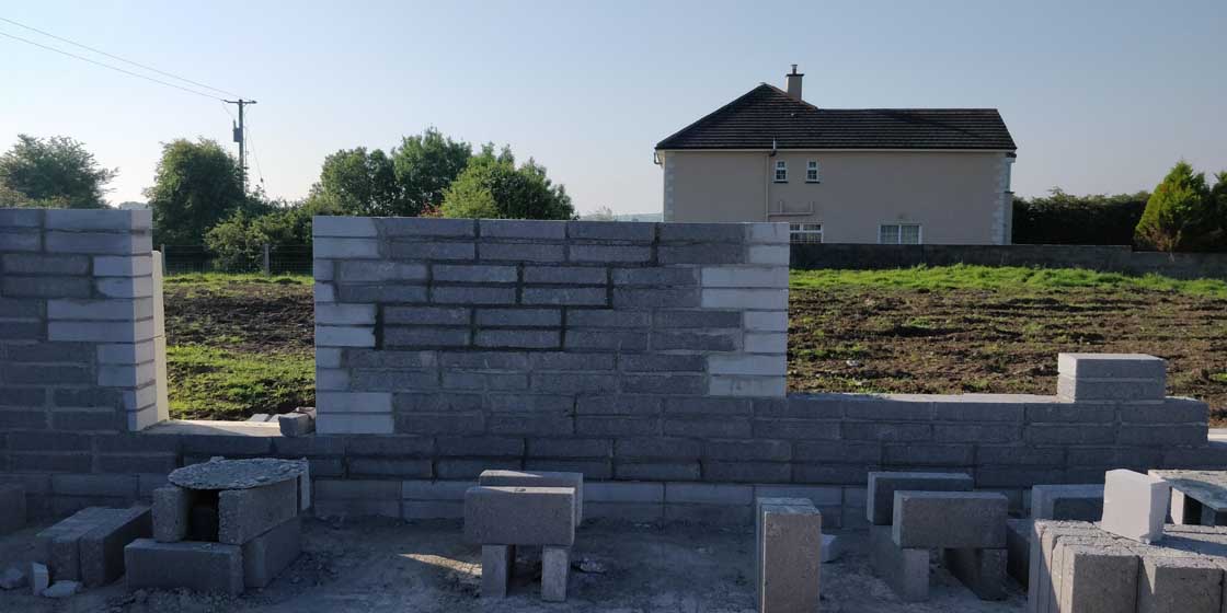 Hession got the bit between his teeth, and approached Martin Collins, general manager of Coshla Quarries in Galway, to run the idea by him. Aided by Ecocem, who developed an accelerant to enable GGBS to be added at high percentages for typical open air blockwork curing facilities, Coshla manufactured 50 per cent GGBS high density concrete blocks for Hession. Aiming for 13 newton strength, independent compression tests showed results of 17 to 22n.