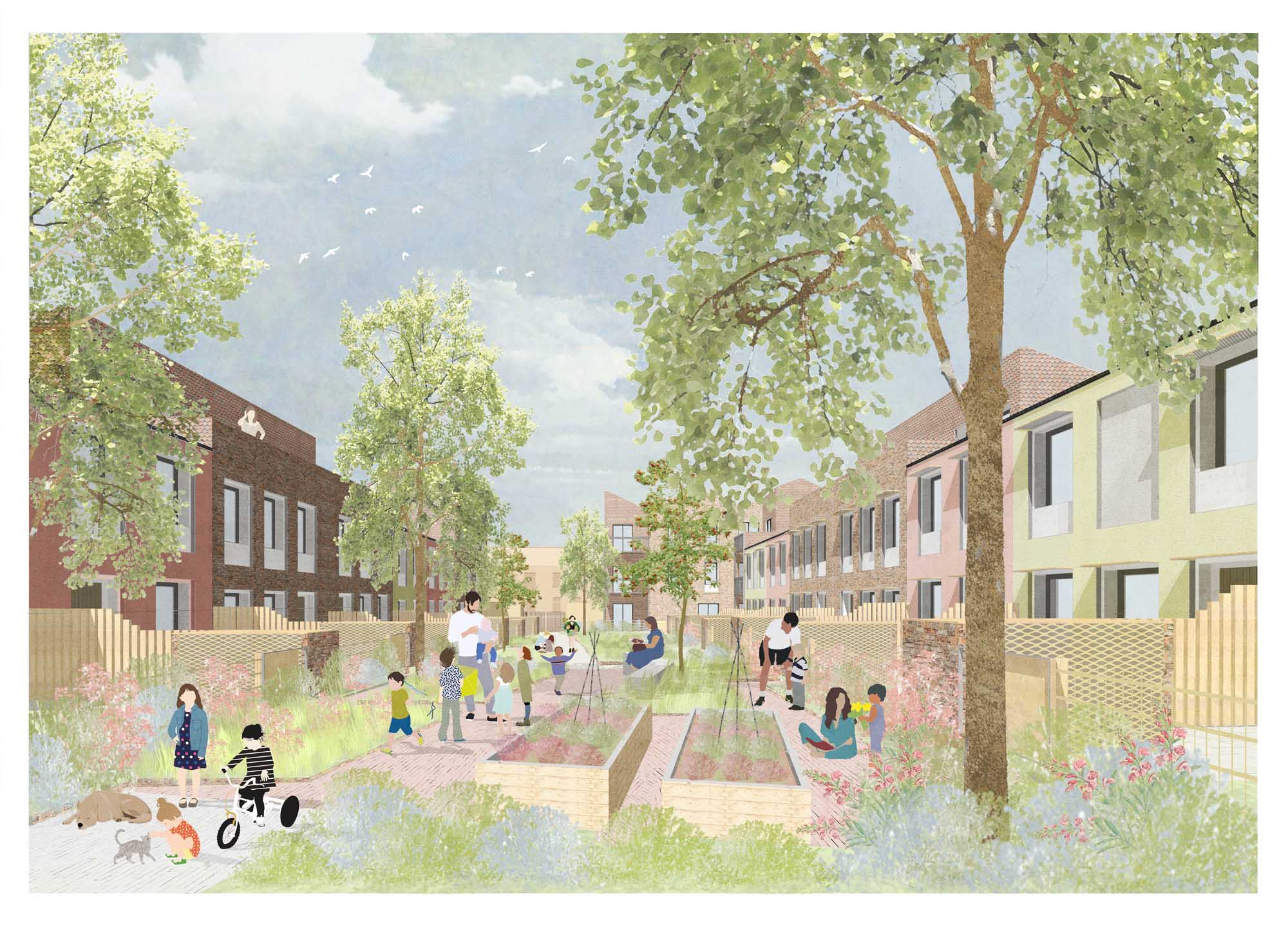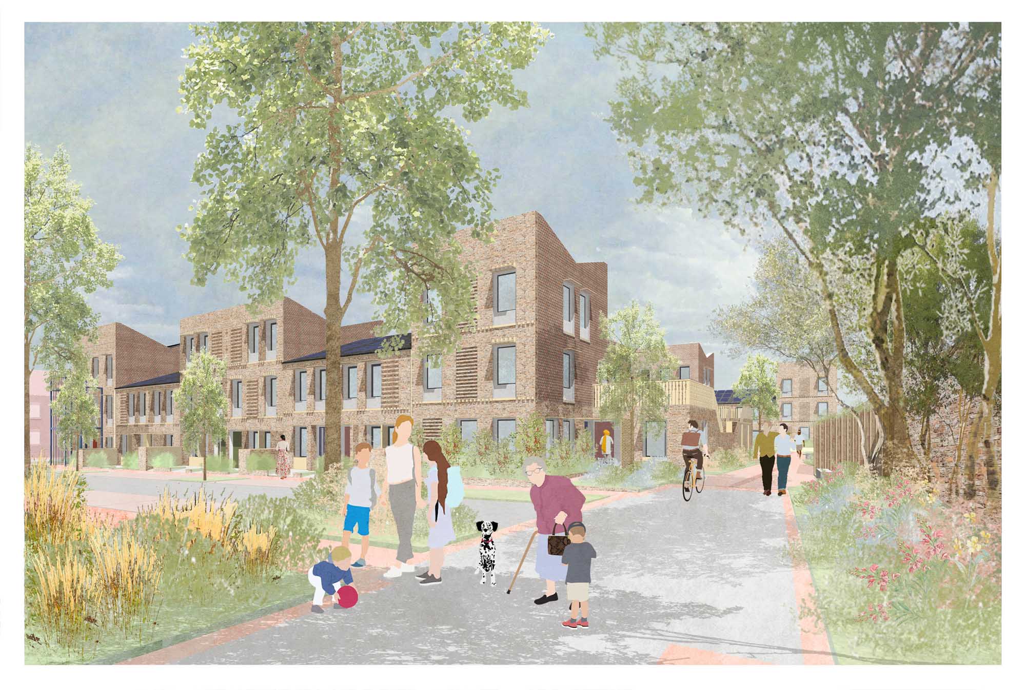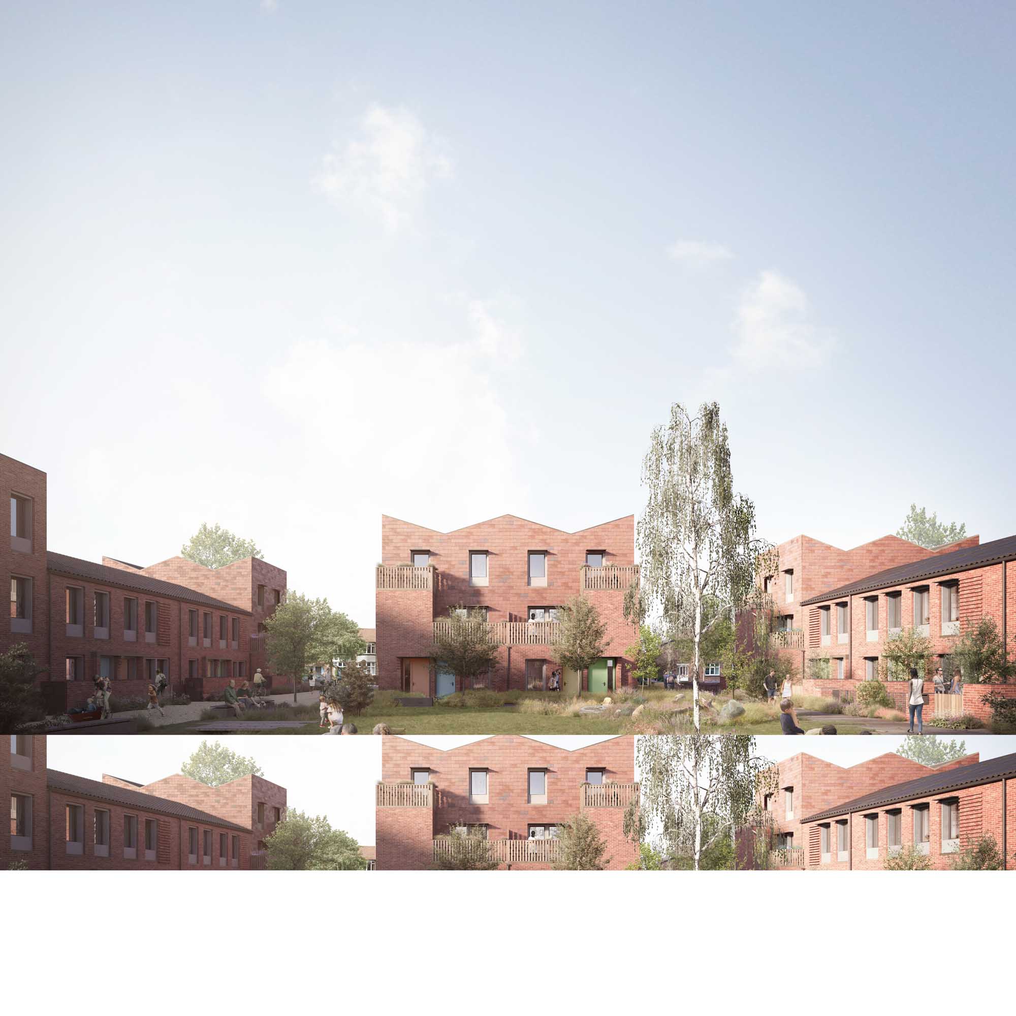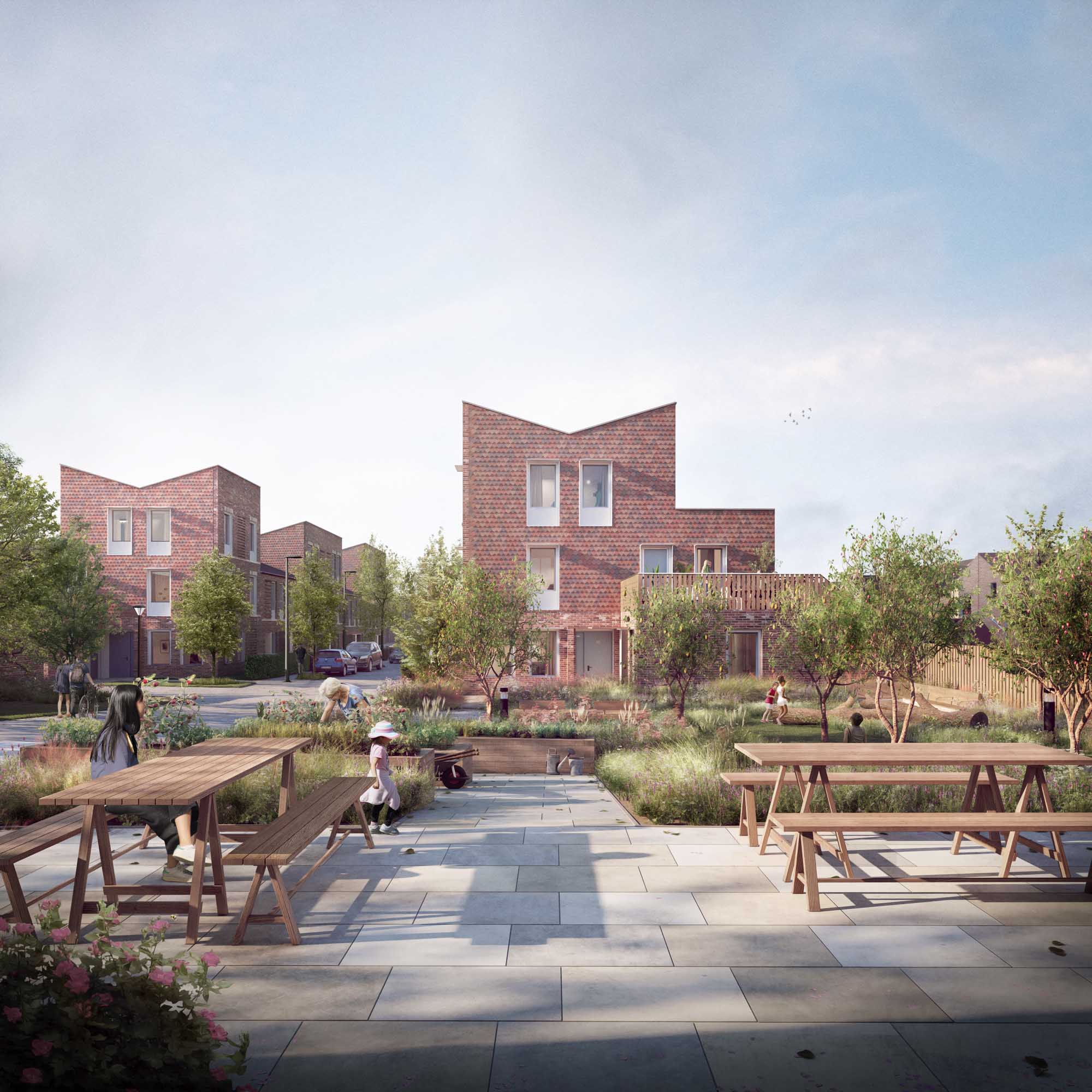 Budget: £13.69 m including land, works and on-costs for the whole development including thirty-four homes, one commercial unit, and high-quality public realm that comprises a central green space and a small civic square.