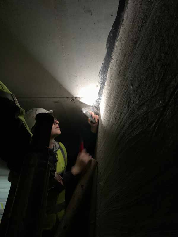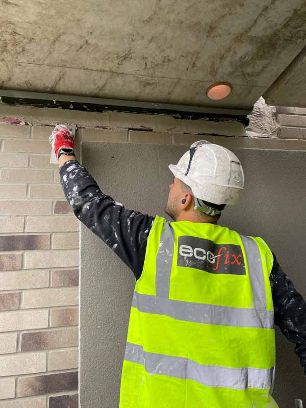 Blowerproof paint-on airtight membrane used here at a concrete ceiling to blockwork junction