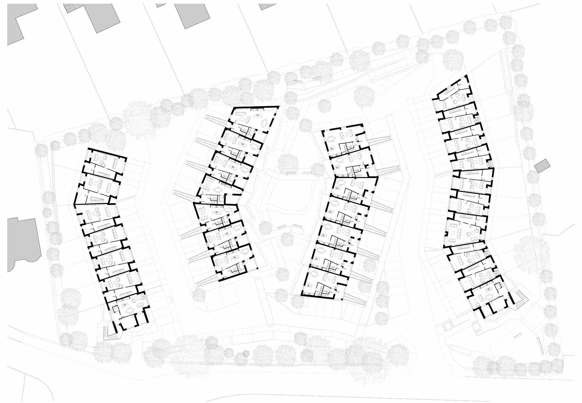 Four individual sites were combined on a south facing slope – a beautiful backdrop surrounded by and shot through with mature trees – for the insertion of four canted blocks comprising 47 passive units.