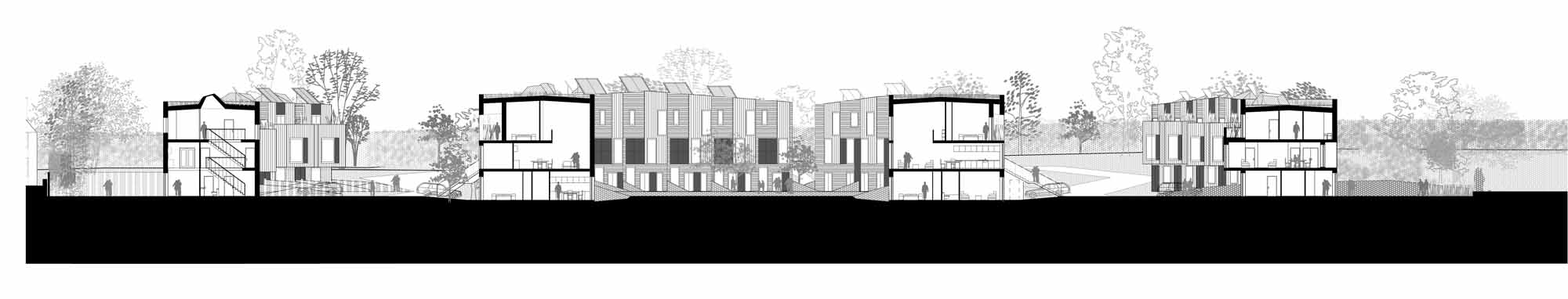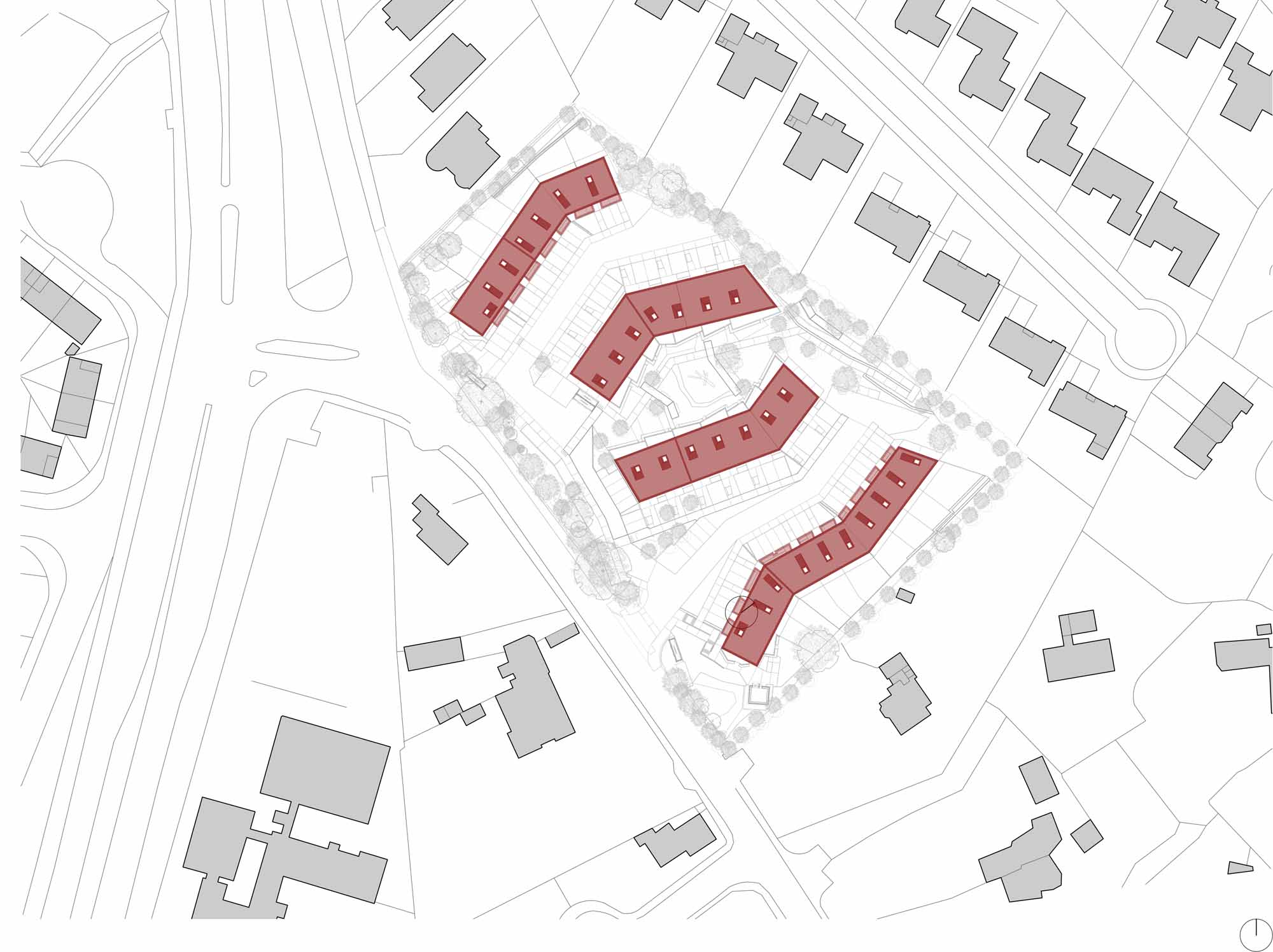 Two blocks of three-storey family houses take up each side of the site with two blocks containing apartments (duplex over ground floor) defining the centre of the site.