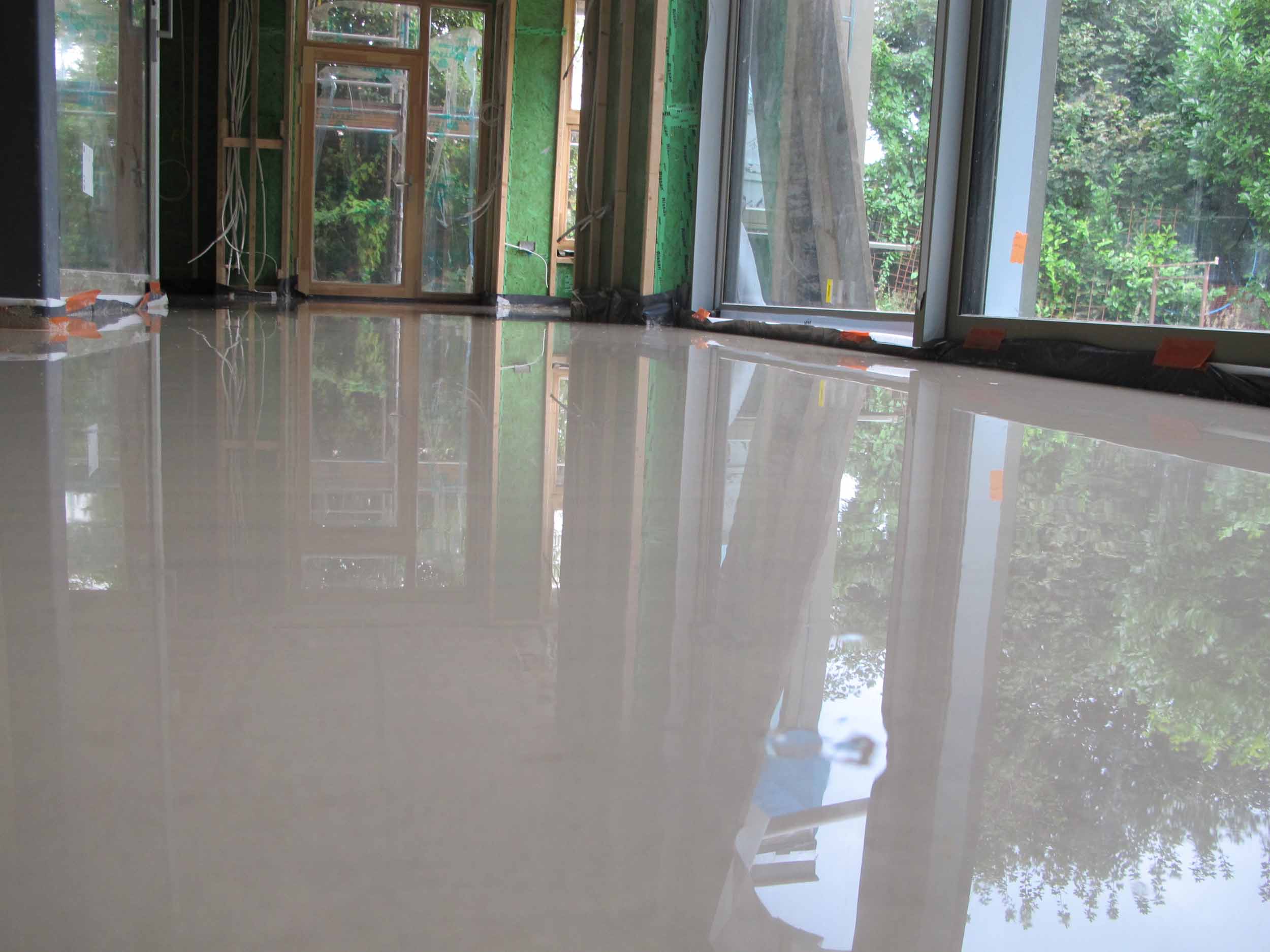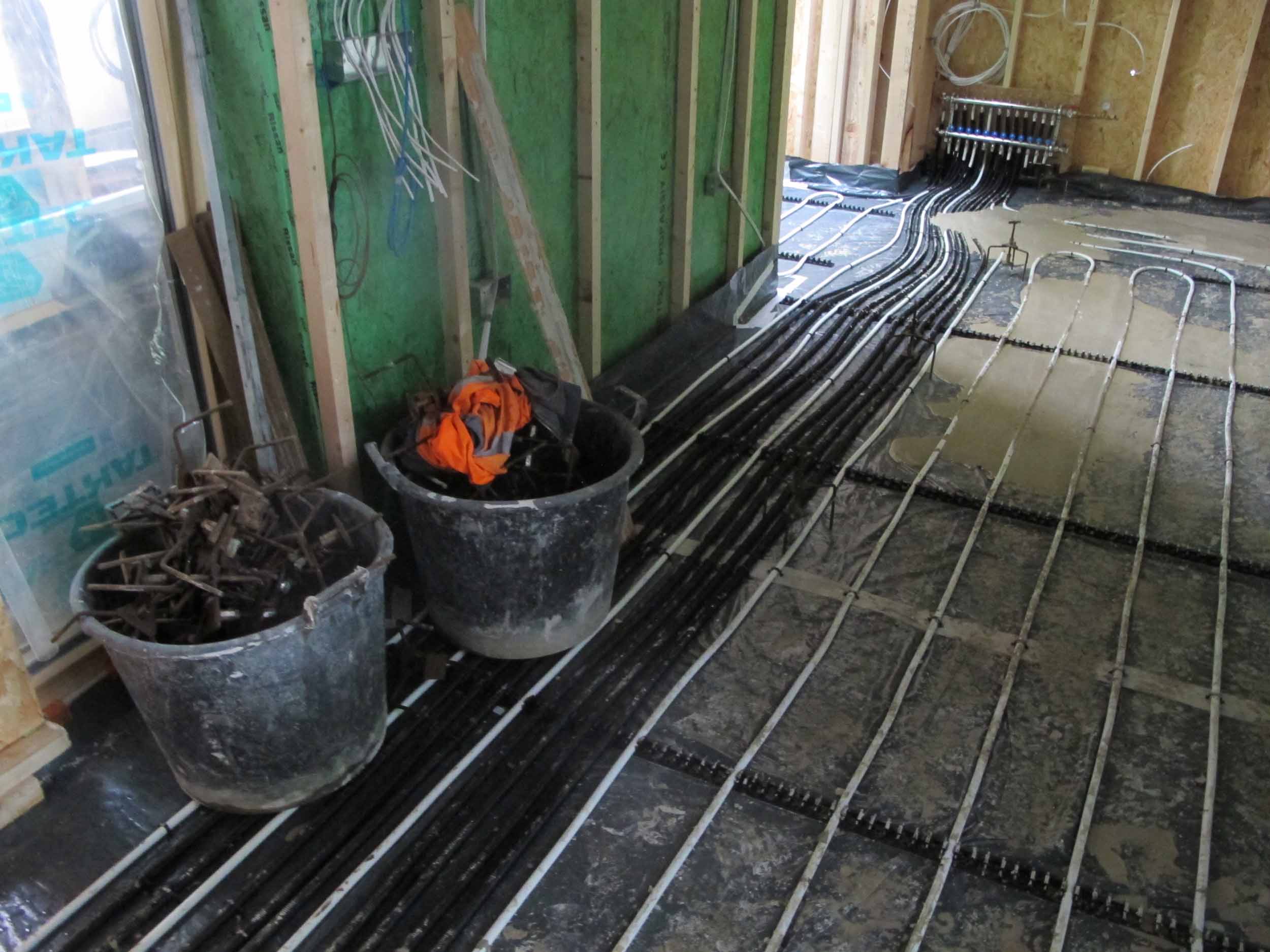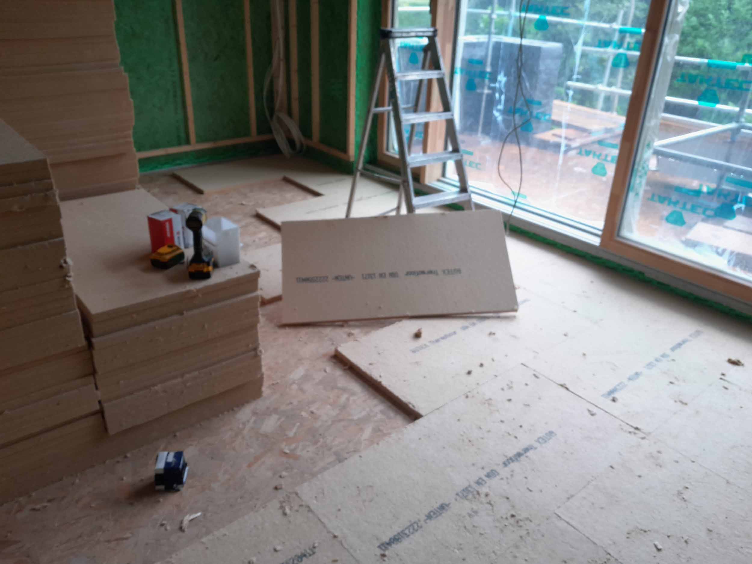 Ground floor: 50 mm Smet Sudanit 280 hemihydrate screed, over Visqueen vapour barrier, over 90 mm Xtratherm Thin-R XT-UF (thermal conductivity 0.022 W/mK), over 70 per cent GGBS RC concrete slab, over 350 mm KORE Airfloor EPS100 insulated foundation system over, Necoflex RMB400 radon barrier. U-Value: 0.071 W/m2K